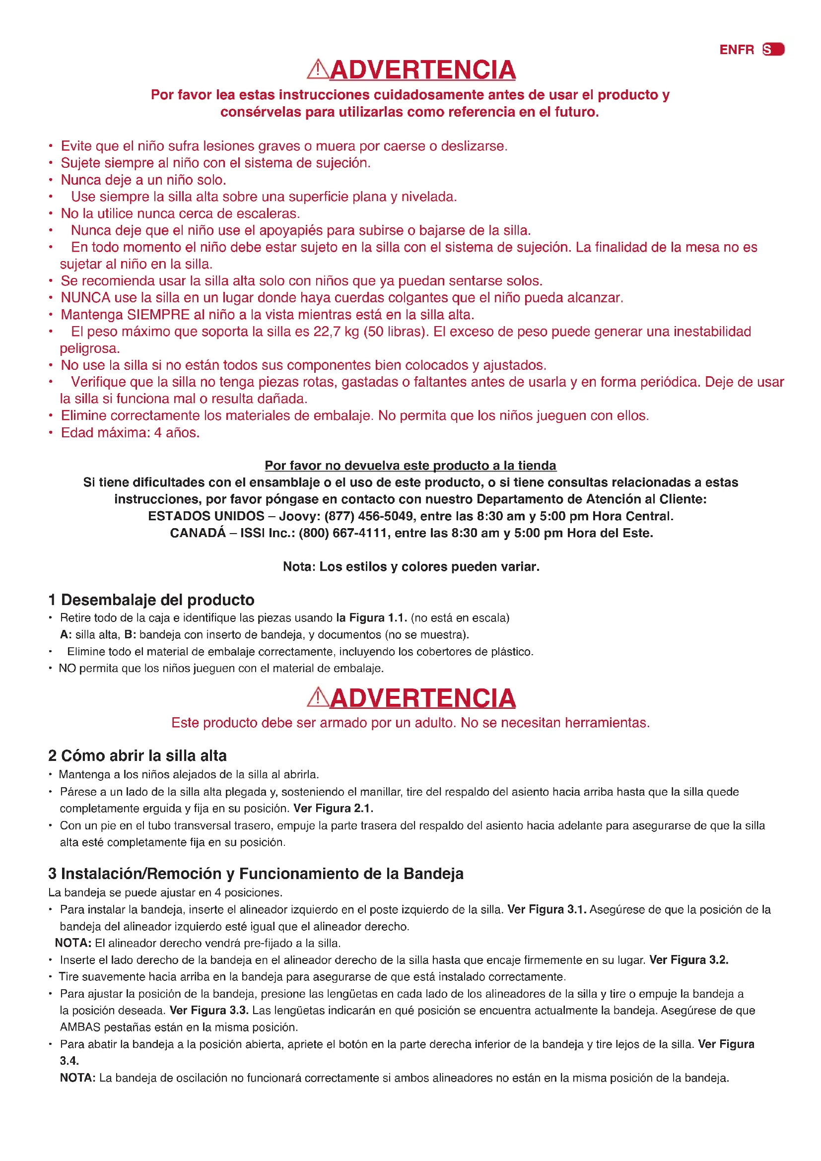 - Gireelrespaldohaciaabajo,endirecciónalsuelo,hastaquelasillaaltaquedecompletamenteplegada.Tengaencuentaquelasillaalta no se bloquea en la posición de plegado.• Paratransportarlasillaalta,tómeladelmanillarenlapartetraseradelasuperciedelasiento. Mantenimiento Sedebenrevisarperiódicamentetodoslosaccesorios,trabas,remachesydemáspiezasmetálicasyplásticasdelasillaparaasegurarse dequeesténbiensujetosynoesténdañadosnifuncionenmal.Elsistemaderetención,ytodoslosotrosobjetosdetelaysuscosturas tambiéndebenserinspeccionadosperiódicamenteparagarantizarqueesténcorrectamenteaseguradosyquenoesténojos,rotos odañadosdeotramanera.Además,sedebenrevisarperiódicamentetodaslaspiezasmóviles,comolamesaylasbisagras,para asegurarse de que funcionen correctamente. Todosloscomponentesfaltantes,rotosodesgastadosdebenserremplazadosinmediatamenteylasillanodebeserutilizadohastaque seremplacen.Sedebenutilizarsolamentecomponentesoriginalesdefábrica.Desernecesario,porfavorpóngaseencontactoconJoovy (Estados Unidos) o ISSI Inc. (Canadá) a nuestra línea telefónica gratuita. Limpieza Los materiales de tela de la silla alta se pueden limpiar utilizando una esponja o un trapo limpio con jabón suave de uso común o detergente y agua tibia. Siempre deje que la tela se seque al aire por completo antes de utilizar la silla alta.EN FR ES
