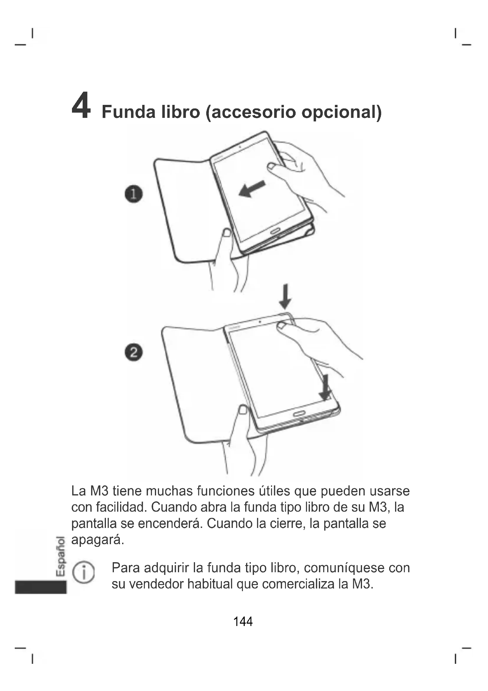 La!M3!tiene!muchas!funciones!útiles!que!pueden!usarse! con!facilidad.!Cuando!abra!la!funda!tipo!libro!de!su!M3,!la! pantalla!se!encenderá.!Cuando!la!cierre,!la!pantalla!se! apagará.! Para!adquirir!la!funda!tipo!libro,!comuníquese!con! su!vendedor!habitual!que!comercializa!la!M3.! !