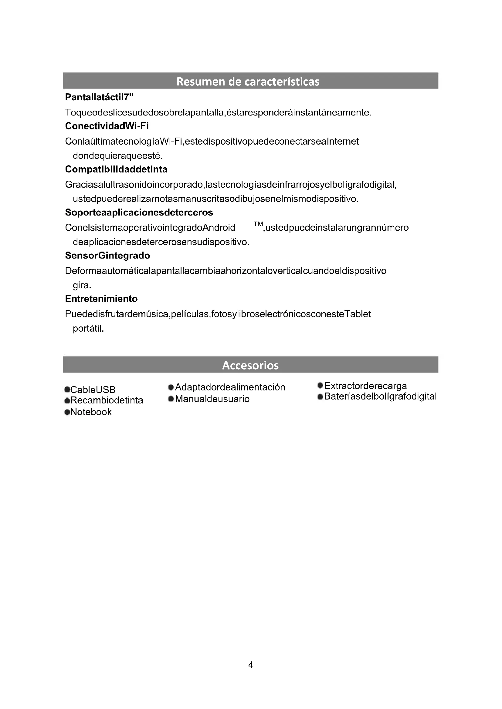 ESPECIFICACIONES..................................................................................... 354 Resumen de características Pan talla táctil 7 ” Toque o deslice su dedo sobre la pantalla, és ta responderá instantáneamente. Conectividad Wi-Fi Con la última tecnología Wi-Fi, este dispositivo puede conectarse a Internet dondequiera que esté. Compatibilidad de tinta Gr acias al ultrasonido incorporado, las tecnologías de infrarrojos y el bolígrafo digital, usted puede reali zar notas manuscritas o dibujos en el mismo dispositivo. Soporte a aplicaciones de terceros Con el sistema operati vo integrado Android