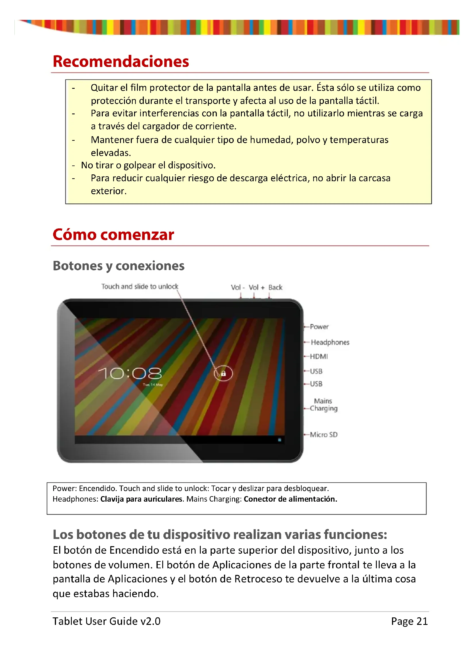 navegación o para volver a la pantalla de Inicio, pulsa el icono de Inicio. Tablet User Guide v2.0 Page 38Resolución de problemas Resetear tu dispositivo a valores por defecto de fábrica Si necesitas resetear tu dispositivo a los valores por defecto de fábrica por cualquier motivo, sigue el siguiente proceso: ¡¡¡ADVERTENCIA!!! Por favor, ten en cuenta que cualquier información actual contenida en el dispositivo se borrará de forma permanente durante este proceso.