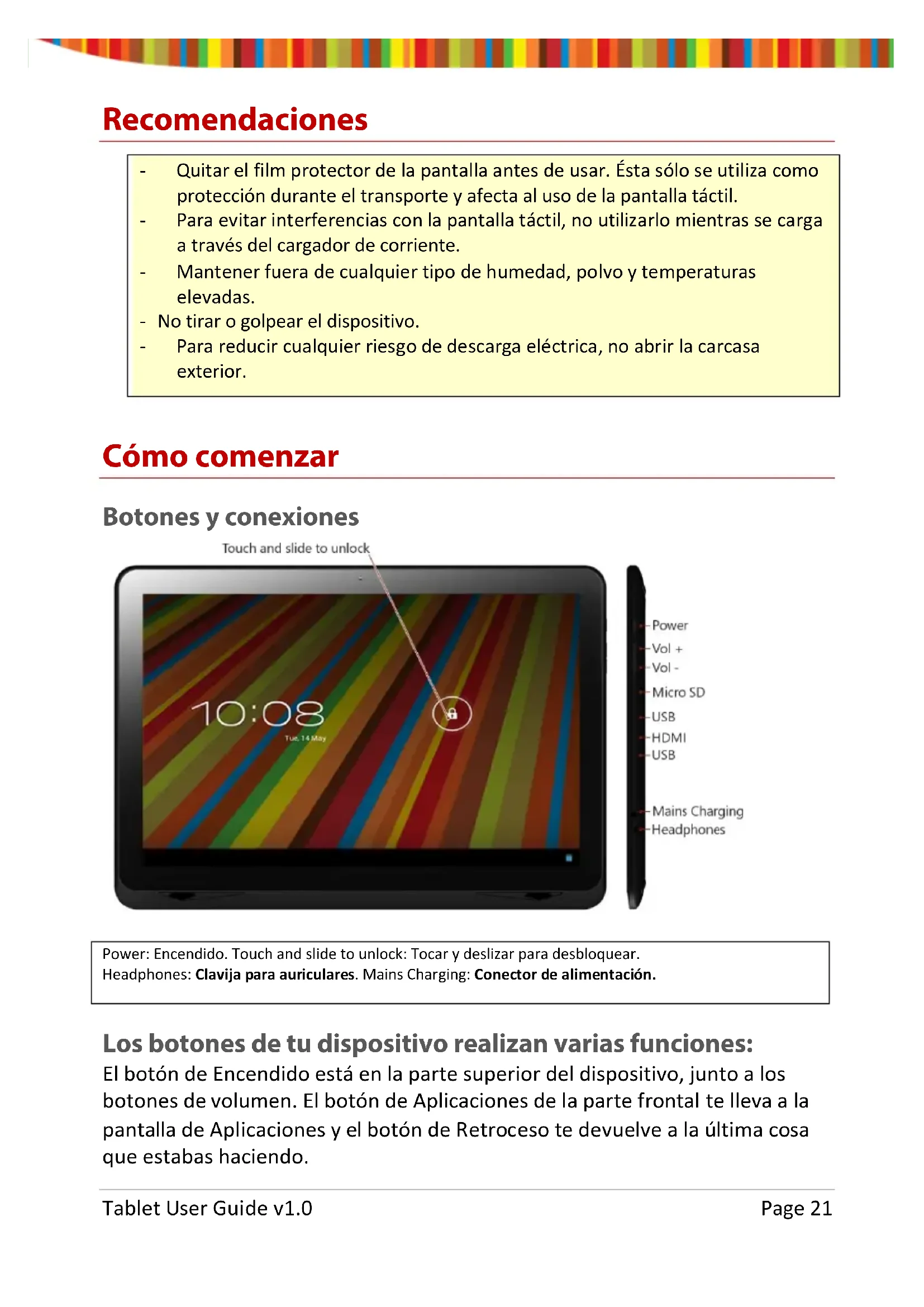 navegación o para volver a la pantalla de Inicio, pulsa el icono de Inicio. Tablet User Guide v1.0 Page 38Resolución de problemas Resetear tu dispositivo a valores por defecto de fábrica Si necesitas resetear tu dispositivo a los valores por defecto de fábrica por cualquier motivo, sigue el siguiente proceso: ¡¡¡ADVERTENCIA!!! Por favor, ten en cuenta que cualquier información actual contenida en el dispositivo se borrará de forma permanente durante este proceso.