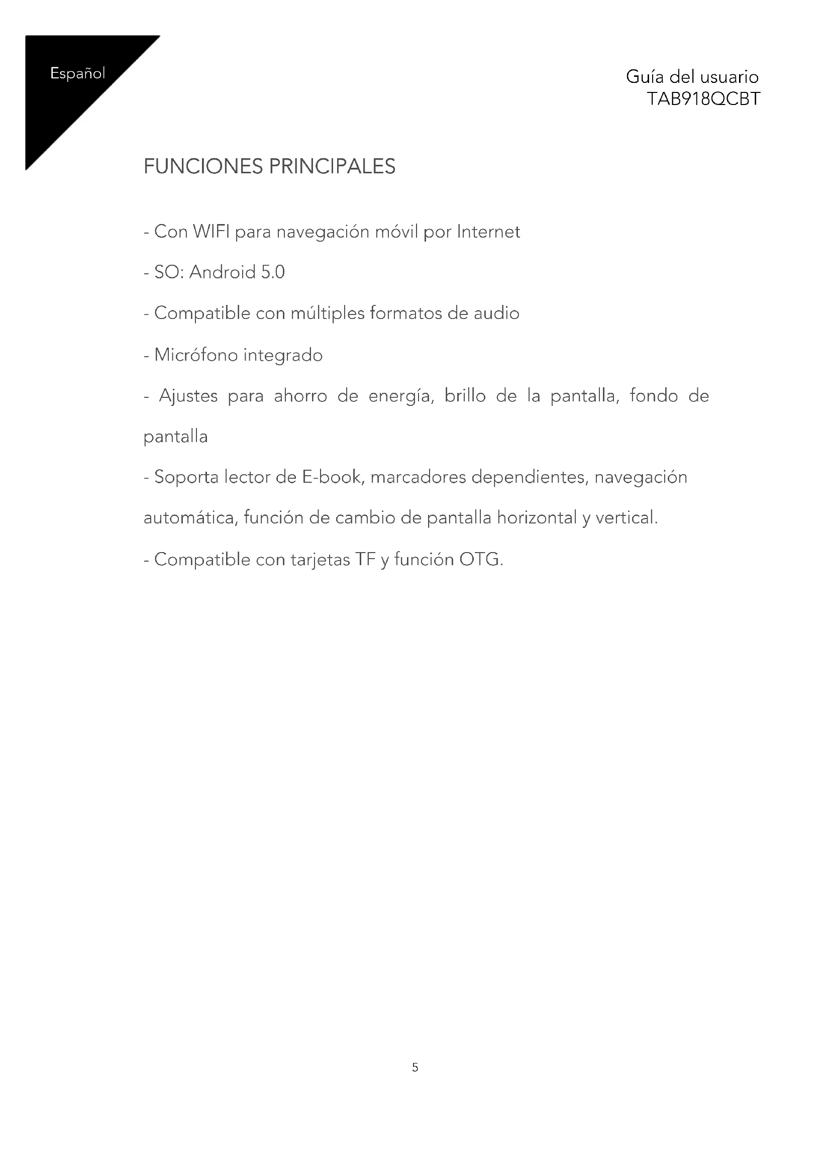 FUNCIONES PRINCIPALES - Con WIFI para navegación móvil por Internet - SO: Android 5.0 - Compatible con múltiples formatos de audio - Micrófono integrado - Ajustes para ahorro de energía, brillo de la pantalla, fondo de pantalla - Soporta lector de E-book, marcadores dependientes, navegación automática, función de cambio de pantalla horizontal y vertical. - Compatible con tarjetas TF y función OTG.6 Guía del usuario