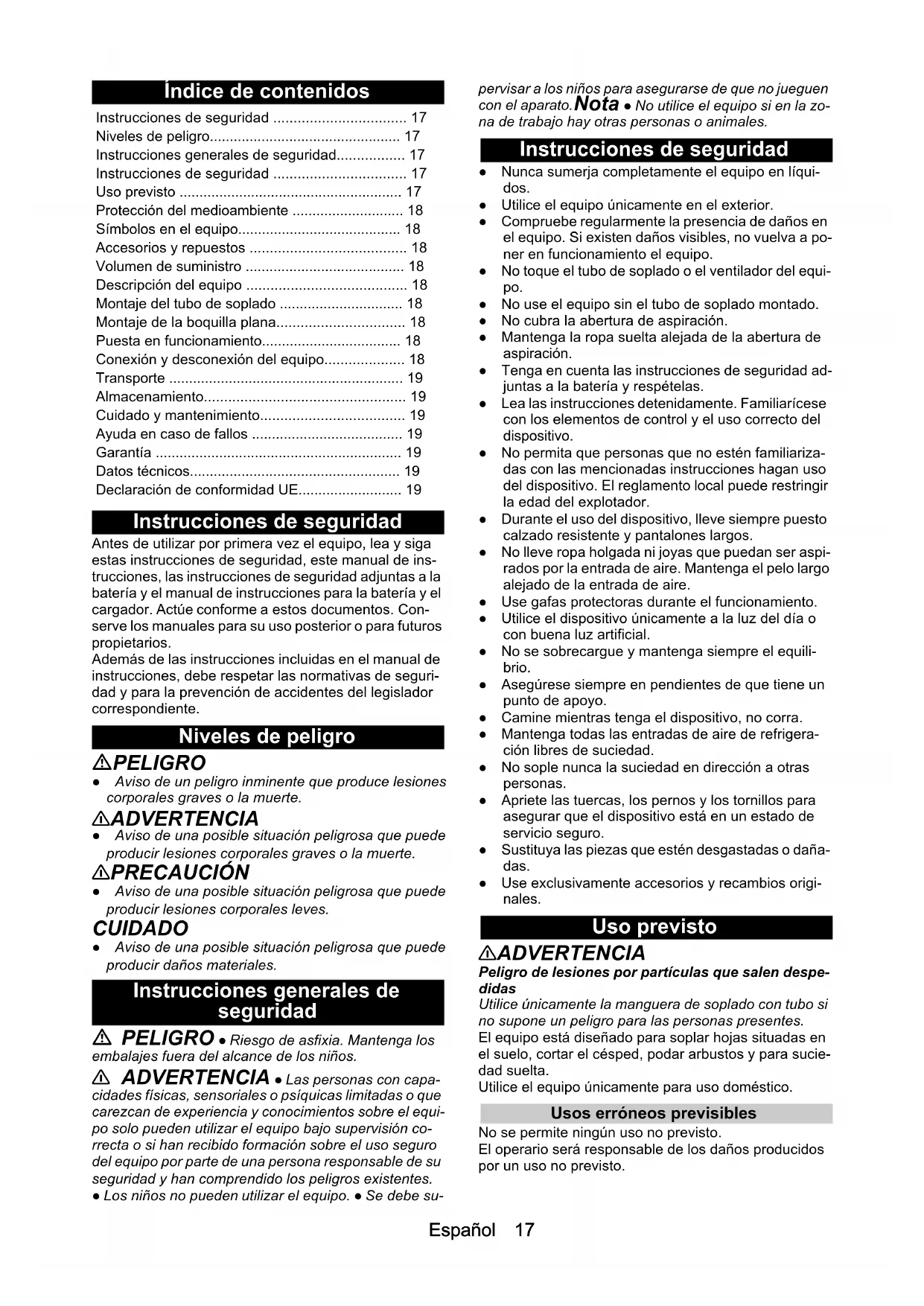 - dB(A) 88 96Español 17 Índice de contenidos Instrucciones de seguridad Antes de utilizar por primera vez el equipo, lea y siga estas instrucciones de seguridad, este manual de ins- trucciones, las instrucciones de seguridad adjuntas a la batería y el manual de instrucciones para la batería y el cargador. Actúe conforme a estos documentos. Con- serve los manuales para su uso posterior o para futuros propietarios. Además de las instrucciones incluidas en el manual de instrucciones, debe respetar las normativas de seguri- dad y para la prevención de accidentes del legislador correspondiente. Niveles de peligro PELIGRO ● Aviso de un peligro inminente que produce lesiones corporales graves o la muerte. 몇 ADVERTENCIA ● Aviso de una posible situación peligrosa que puede producir lesiones corporales graves o la muerte. 몇 PRECAUCIÓN ● Aviso de una posible situación peligrosa que puede producir lesiones corporales leves. CUIDADO ● Aviso de una posible situación peligrosa que puede producir daños materiales. Instrucciones generales de seguridad PELIGRO ● Riesgo de asfixia. Mantenga los embalajes fuera del alcance de los niños. 몇 ADVERTENCIA ● Las personas con capa- cidades físicas, sensoriales o psíquicas limitadas o que carezcan de experiencia y conocimientos sobre el equi- po solo pueden utilizar el equipo bajo supervisión co- rrecta o si han recibido formación sobre el uso seguro del equipo por parte de una persona responsable de su seguridad y han comprendido los peligros existentes. ● Los niños no pueden utilizar el equipo. ● Se debe su- pervisar a los niños para asegurarse de que no jueguen con el aparato. Nota ● No utilice el equipo si en la zo- na de trabajo hay otras personas o animales. Instrucciones de seguridad ● Nunca sumerja completamente el equipo en líqui- dos. ● Utilice el equipo únicamente en el exterior. ● Compruebe regularmente la presencia de daños en el equipo. Si existen daños visibles, no vuelva a po- ner en funcionamiento el equipo. ● No toque el tubo de soplado o el ventilador del equi- po. ● No use el equipo sin el tubo de soplado montado. ● No cubra la abertura de aspiración. ● Mantenga la ropa suelta alejada de la abertura de aspiración. ● Tenga en cuenta las instrucciones de seguridad ad- juntas a la batería y respételas. ● Lea las instrucciones detenidamente. Familiarícese con los elementos de control y el uso correcto del dispositivo. ● No permita que personas que no estén familiariza- das con las mencionadas instrucciones hagan uso del dispositivo. El reglamento local puede restringir la edad del explotador. ● Durante el uso del dispositivo, lleve siempre puesto calzado resistente y pantalones largos. ● No lleve ropa holgada ni joyas que puedan ser aspi- rados por la entrada de aire. Mantenga el pelo largo alejado de la entrada de aire. ● Use gafas protectoras durante el funcionamiento. ● Utilice el dispositivo únicamente a la luz del día o con buena luz artificial. ● No se sobrecargue y mantenga siempre el equili- brio. ● Asegúrese siempre en pendientes de que tiene un punto de apoyo. ● Camine mientras tenga el dispositivo, no corra. ● Mantenga todas las entradas de aire de refrigera- ción libres de suciedad. ● No sople nunca la suciedad en dirección a otras personas. ● Apriete las tuercas, los pernos y los tornillos para asegurar que el dispositivo está en un estado de servicio seguro. ● Sustituya las piezas que estén desgastadas o daña- das. ● Use exclusivamente accesorios y recambios origi- nales. Uso previsto 몇 ADVERTENCIA Peligro de lesiones por partículas que salen despe- didas Utilice únicamente la manguera de soplado con tubo si no supone un peligro para las personas presentes. El equipo está diseñado para soplar hojas situadas en el suelo, cortar el césped, podar arbustos y para sucie- dad suelta. Utilice el equipo únicamente para uso doméstico. Usos erróneos previsibles No se permite ningún uso no previsto. El operario será responsable de los daños producidos por un uso no previsto. Instrucciones de seguridad p. 17