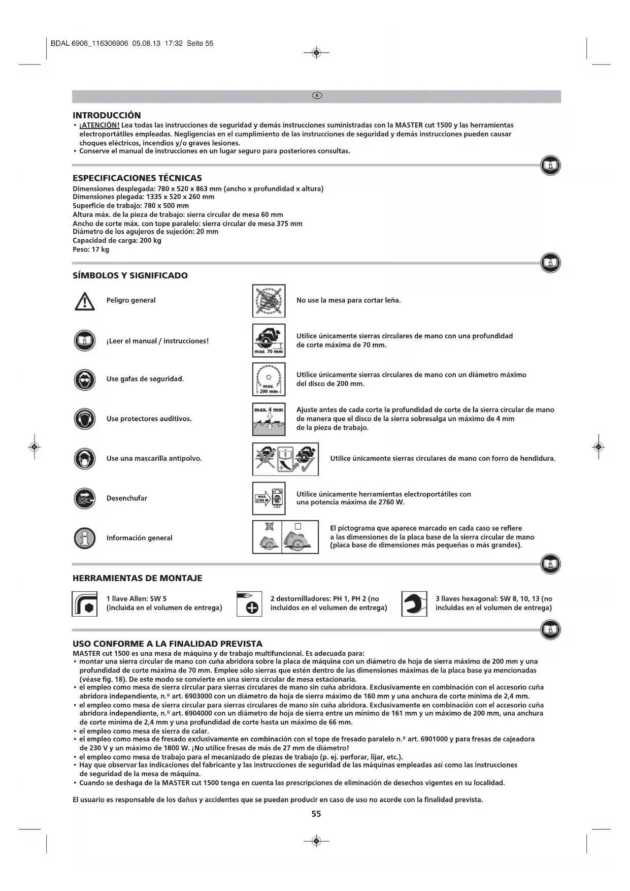 - Cuando se deshaga de la MASTER cut 1500 tenga en cuenta las prescripciones de eliminación de desechos vigentes en su localidad. El usuario es responsable de los daños y accidentes que se puedan producir en caso de uso no acorde con la finalidad prevista. Utilice únicamente herramientas electroportátiles con una potencia máxima de 2760 W. BDAL 6906_116306906 05.08.13 17:32 Seite 5556