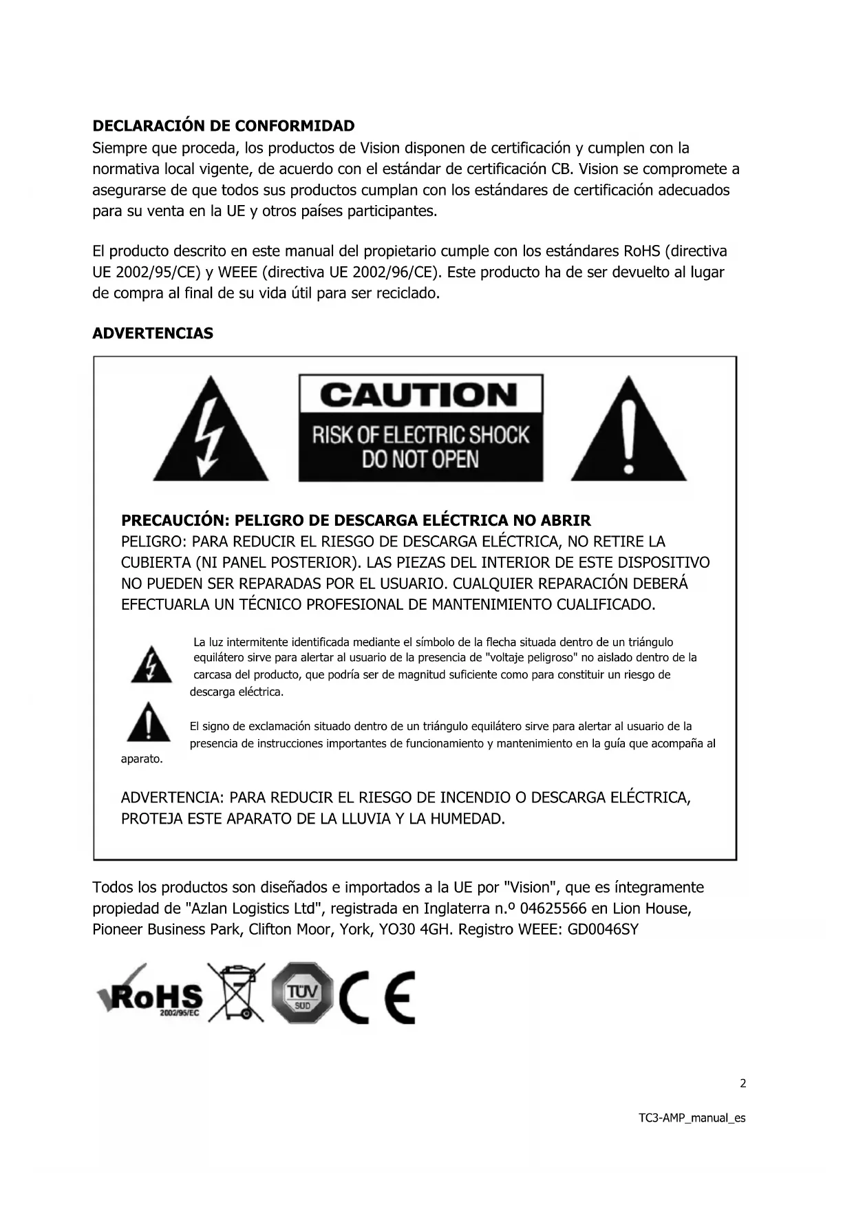 Todos los productos son diseñados e importados a la UE por "Vision", que es íntegramente propiedad de "Azlan Logistics Ltd", registrada en Inglaterra n.º 04625566 en Lion House, Pioneer Business Park, Clifton Moor, York, YO30 4GH. Registro WEEE: GD0046SY