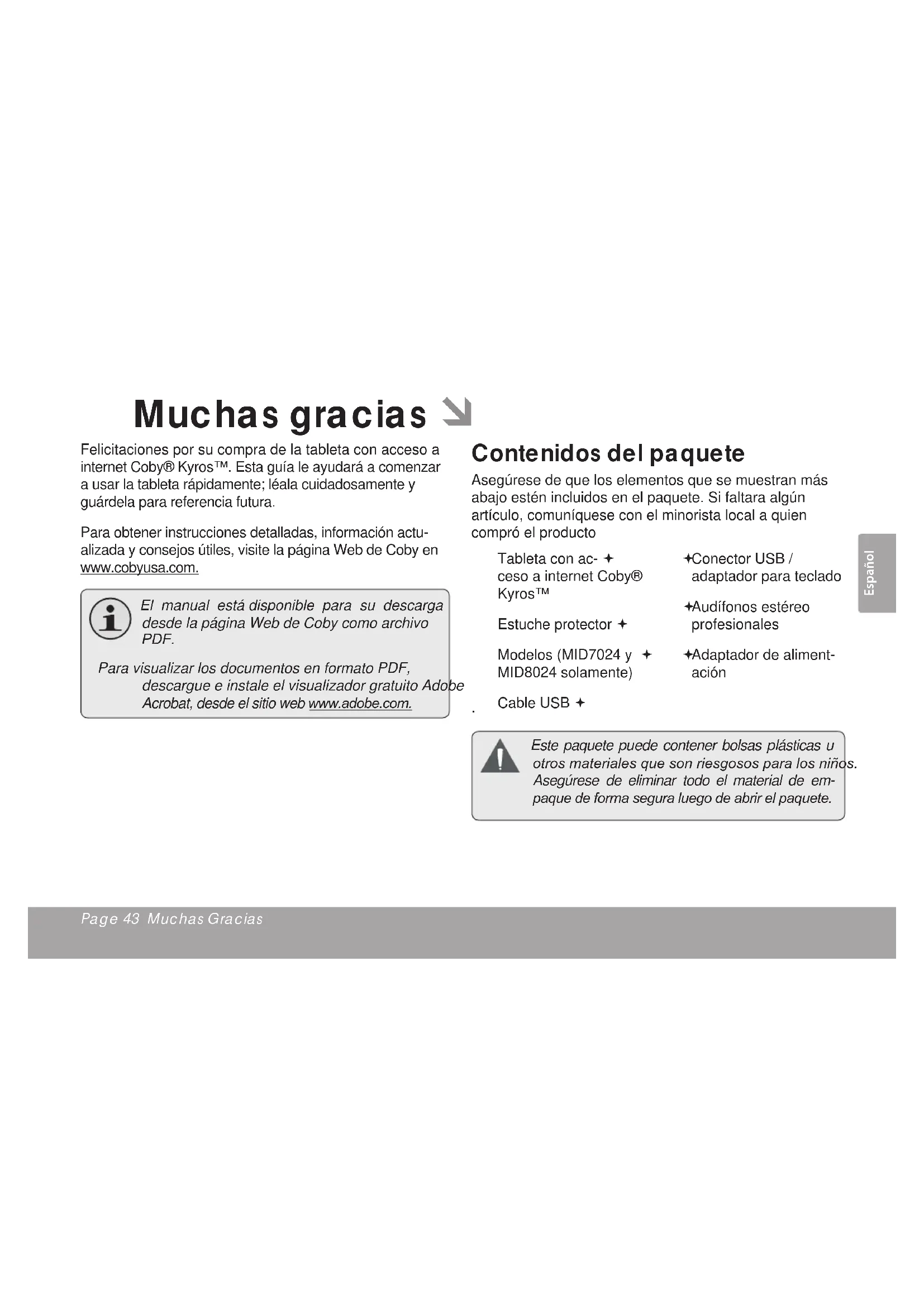 - AVISOS DE SEGURIDAD Español Page 43 Muchas Gracias Muchas gracias  Felicitaciones por su compra de la tableta con acceso a internet Coby® Kyros™. Esta guía le ayudará a comenzar a usar la tableta rápidamente; léala cuidadosamente y guárdela para referencia futura. Para obtener instrucciones detalladas, información actu- alizada y consejos útiles, visite la página Web de Coby en www.cobyusa.com. El manual está disponible para su descarga desde la página Web de Coby como archivo PDF. Para visualizar los documentos en formato PDF, descargue e instale el visualizador gratuito Adobe Acrobat, desde el sitio web www.adobe.com. Contenidos del paquete Asegúrese de que los elementos que se muestran más abajo estén incluidos en el paquete. Si faltara algún artículo, comuníquese con el minorista local a quien compró el producto p. 79