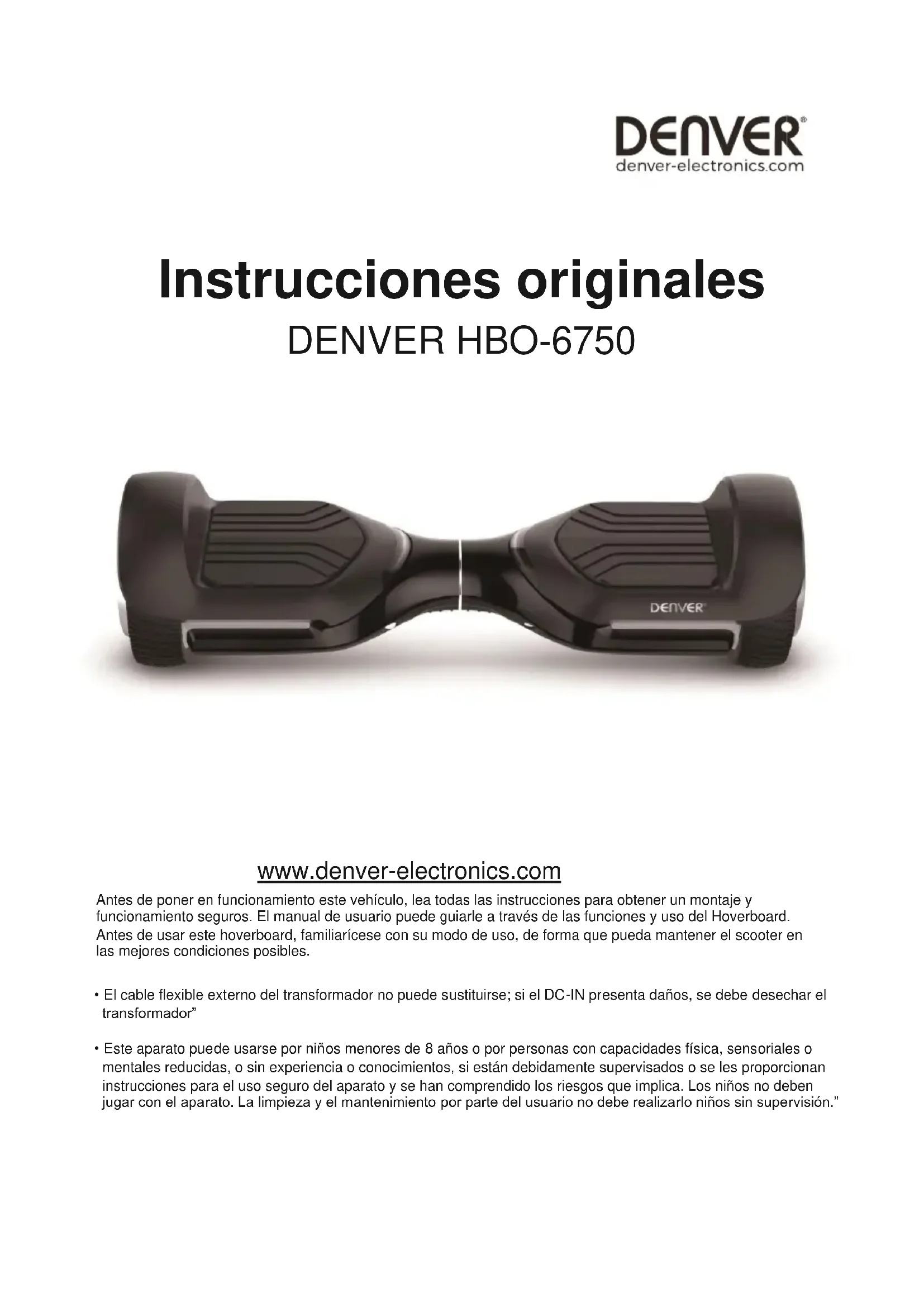 Og derfor overholder de væsentlige krav i Maskindirektivet. Identitet og underskrift for den person, der er bemyndiget til at udarbejde deklarationen og kompilerede Tekniske filer på vegne af producenten: Underskrift: Fulde navn: Alfred Blank Stilling: Administrerende direktør Firma: DENVER ELECTRONICS A/S Dato: 27th. July 2020Instrucciones originales DENVER HBO-6750 www.denver-electronics.com Antes de poner en funcionamiento este vehículo, lea todas las instrucciones para obtener un montaje y funcionamiento seguros. El manual de usuario puede guiarle a través de las funciones y uso del Hoverboard. Antes de usar este hoverboard, familiarícese con su modo de uso, de forma que pueda mantener el scooter en las mejores condiciones posibles.