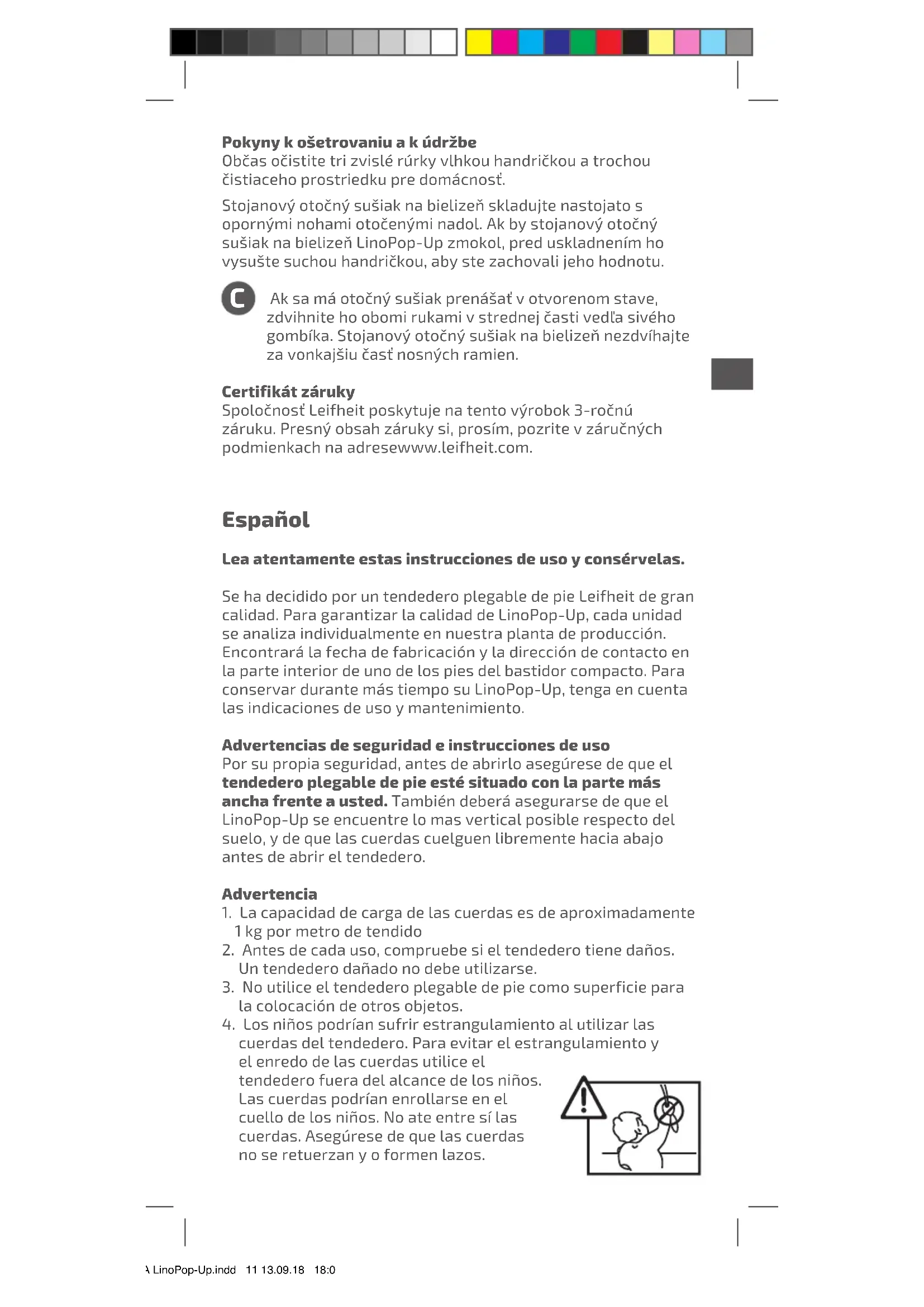 Ak sa má otočný sušiak prenášať v otvorenom stave, zdvihnite ho obomi rukami v strednej časti vedľa sivého gombíka. Stojanový otočný sušiak na bielizeň nezdvíhajte za vonkajšiu časť nosných ramien. Certifikát záruky Spoločnosť Leifheit poskytuje na tento výrobok 3-ročnú záruku. Presný obsah záruky si, prosím, pozrite v záručných podmienkach na adresewww.leifheit.com. Español Lea atentamente estas instrucciones de uso y consérvelas. Se ha decidido por un tendedero plegable de pie Leifheit de gran calidad. Para garantizar la calidad de LinoPop-Up, cada unidad se analiza individualmente en nuestra planta de producción. Encontrará la fecha de fabricación y la dirección de contacto en la parte interior de uno de los pies del bastidor compacto. Para conservar durante más tiempo su LinoPop-Up, tenga en cuenta las indicaciones de uso y mantenimiento. Advertencias de seguridad e instrucciones de uso Por su propia seguridad, antes de abrirlo asegúrese de que el tendedero plegable de pie esté situado con la parte más ancha frente a usted. También deberá asegurarse de que el LinoPop-Up se encuentre lo mas vertical posible respecto del suelo, y de que las cuerdas cuelguen libremente hacia abajo antes de abrir el tendedero. Advertencia