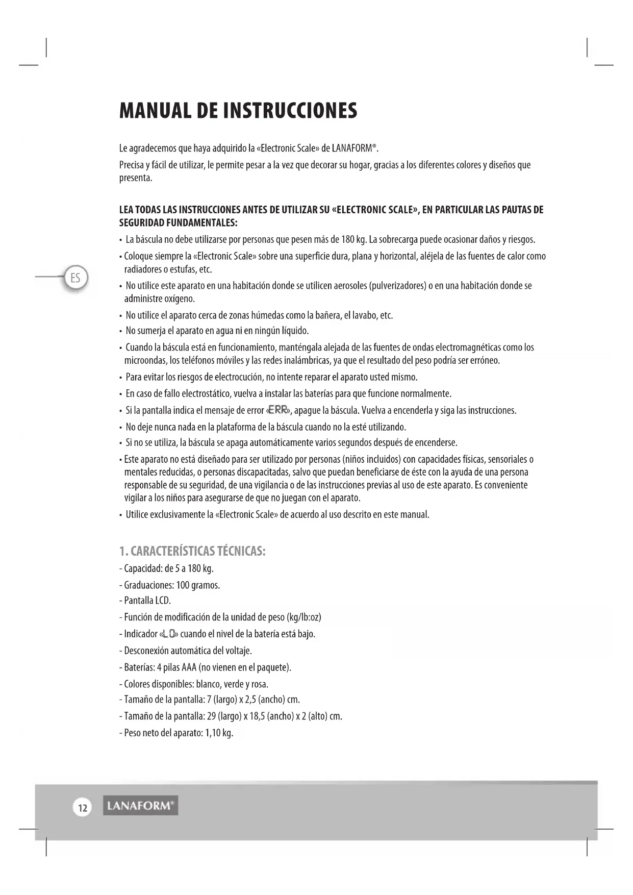 Le agradecemos que haya adquirido la «Electronic Scale» de LANAFORM®. Precisa y fácil de utilizar, le permite pesar a la vez que decorar su hogar, gracias a los diferentes colores y diseños que presenta. LEA TODAS LAS INSTRUCCIONES ANTES DE UTILIZAR SU «ELECTRONIC SCALE», EN PARTICULAR LAS PAUTAS DE SEGURIDAD FUNDAMENTALES: