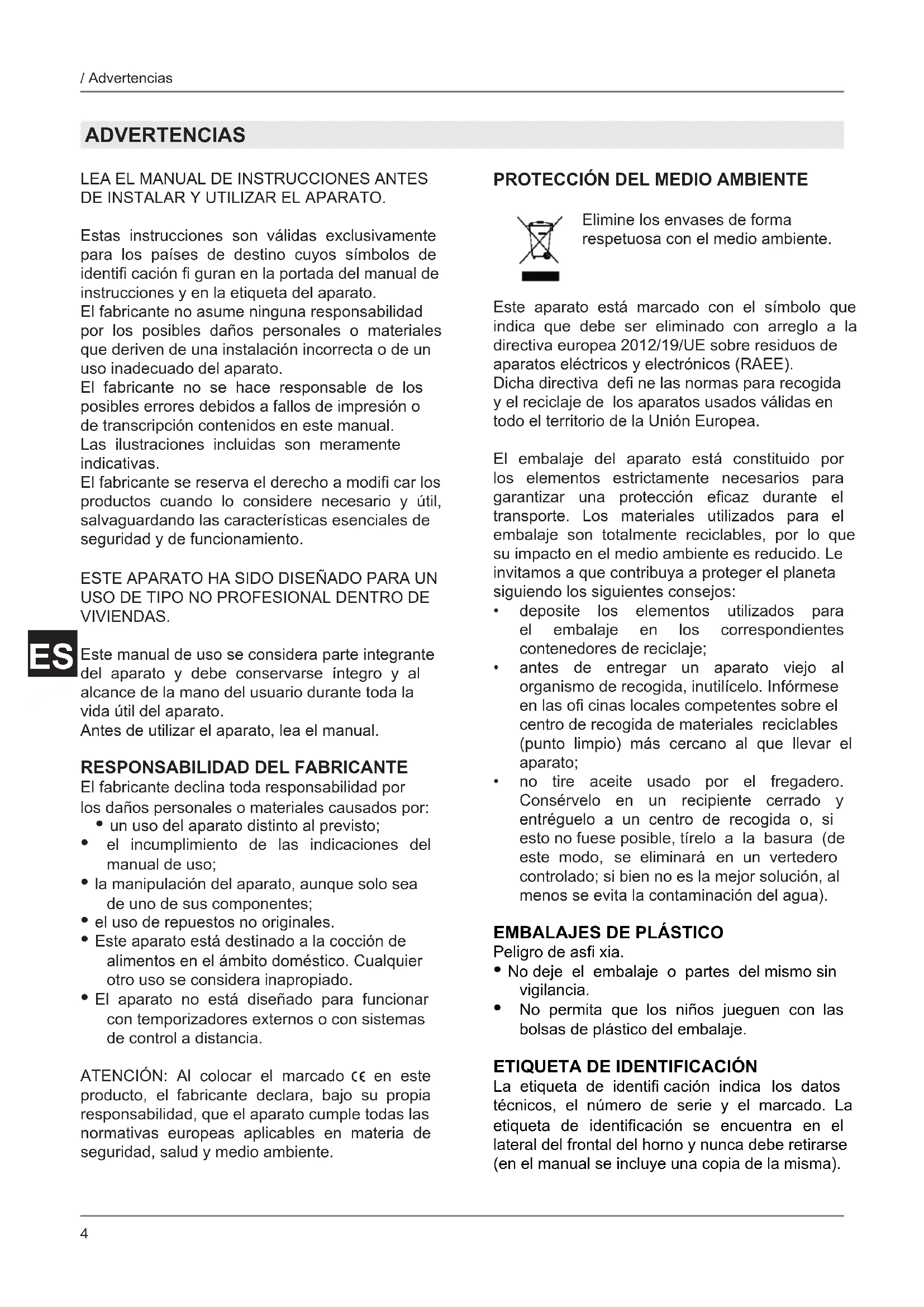 La etiqueta de identifi cación indica los datos técnicos, el número de serie y el marcado. La etiqueta de identifi cación se encuentra en el lateral del frontal del horno y nunca debe retirarse (en el manual se incluye una copia de la misma). Elimine los envases de forma respetuosa con el medio ambiente.5