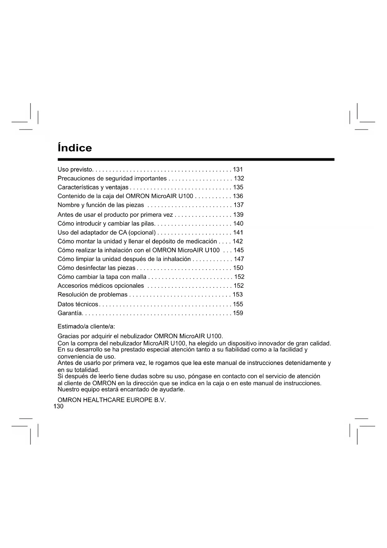 - Español MESH NEBULIZER MicroAIR U100 (NE-U100-E) ES130 Índice Estimado/a cliente/a: Gracias por adquirir el nebulizador OMRON MicroAIR U100. Con la compra del nebulizador MicroAIR U100, ha elegido un dispositivo innovador de gran calidad. En su desarrollo se ha prestado especial atención tanto a su fiabilidad como a la facilidad y conveniencia de uso. Antes de usarlo por primera vez, le rogamos que lea este manual de instrucciones detenidamente y en su totalidad. Si después de leerlo tiene dudas sobre su uso, póngase en contacto con el servicio de atención al cliente de OMRON en la dirección que se indica en la caja o en este manual de instrucciones. Nuestro equipo estará encantado de ayudarle. OMRON HEALTHCARE EUROPE B.V. Uso previsto. . . . . . . . . . . . . . . . . . . . . . . . . . . . . . . . . . . . . . . . . 131 Precauciones de seguridad importantes . . . . . . . . . . . . . . . . . . . 132 Características y ventajas . . . . . . . . . . . . . . . . . . . . . . . . . . . . . . 135 Contenido de la caja del OMRON MicroAIR U100 . . . . . . . . . . . 136 Nombre y función de las piezas . . . . . . . . . . . . . . . . . . . . . . . . . 137 Antes de usar el producto por primera vez . . . . . . . . . . . . . . . . . 139 Cómo introducir y cambiar las pilas. . . . . . . . . . . . . . . . . . . . . . . 140 Uso del adaptador de CA (opcional) . . . . . . . . . . . . . . . . . . . . . . 141 Cómo montar la unidad y llenar el depósito de medicación . . . . 142 Cómo realizar la inhalación con el OMRON MicroAIR U100 . . . 145 Cómo limpiar la unidad después de la inhalación . . . . . . . . . . . . 147 Cómo desinfectar las piezas . . . . . . . . . . . . . . . . . . . . . . . . . . . . 150 Cómo cambiar la tapa con malla . . . . . . . . . . . . . . . . . . . . . . . . . 152 Accesorios médicos opcionales . . . . . . . . . . . . . . . . . . . . . . . . . 152 Resolución de problemas . . . . . . . . . . . . . . . . . . . . . . . . . . . . . . 153 Datos técnicos . . . . . . . . . . . . . . . . . . . . . . . . . . . . . . . . . . . . . . . 155 Garantía. . . . . . . . . . . . . . . . . . . . . . . . . . . . . . . . . . . . . . . . . . . . 159131 Uso previsto Objetivo médico Este producto está destinado para su uso con medicamentos inhalados indicados en el tratamiento de trastornos respiratorios. Usuario al que está destinado