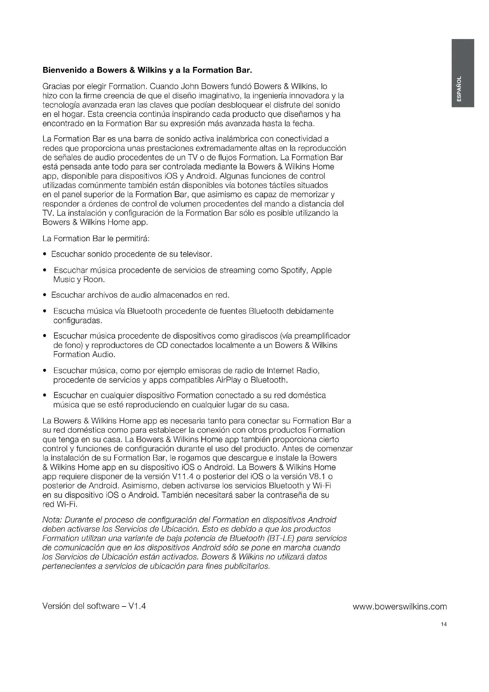 - Escuchar en cualquier dispositivo Formation conectado a su red doméstica música que se esté reproduciendo en cualquier lugar de su casa. La Bowers & Wilkins Home app es necesaria tanto para conectar su Formation Bar a su red doméstica como para establecer la conexión con otros productos Formation que tenga en su casa. La Bowers & Wilkins Home app también proporciona cierto control y funciones de conguración durante el uso del producto. Antes de comenzar la instalación de su Formation Bar, le rogamos que descargue e instale la Bowers & Wilkins Home app en su dispositivo iOS o Android. La Bowers & Wilkins Home app requiere disponer de la versión V11.4 o posterior del iOS o la versión V8.1 o posterior de Android. Asimismo, deben activarse los servicios Bluetooth y Wi-Fi en su dispositivo iOS o Android. También necesitará saber la contraseña de su redWi-Fi. Nota: Durante el proceso de conguración del Formation en dispositivos Android deben activarse los Servicios de Ubicación. Esto es debido a que los productos Formation utilizan una variante de baja potencia de Bluetooth (BT-LE) para servicios de comunicación que en los dispositivos Android sólo se pone en marcha cuando los Servicios de Ubicación están activados. Bowers & Wilkins no utilizará datos pertenecientes a servicios de ubicación para nes publicitarios. Versión del software – V1.4 ESPAÑOL Contents ESPAÑOL 1