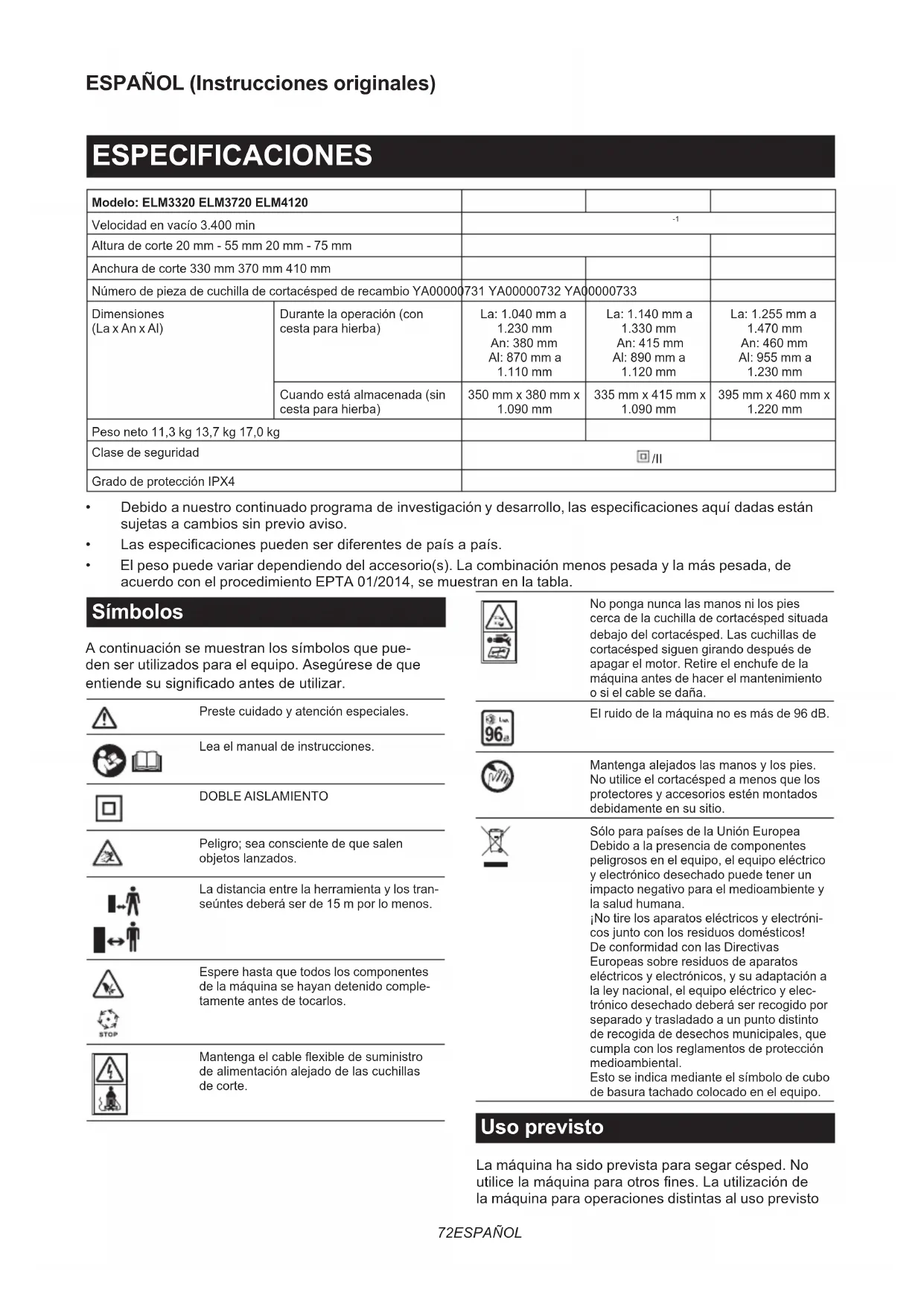 - El peso puede variar dependiendo del accesorio(s). La combinación menos pesada y la más pesada, de acuerdo con el procedimiento EPTA 01/2014, se muestran en la tabla. Símbolos A continuación se muestran los símbolos que pue- den ser utilizados para el equipo. Asegúrese de que entiendesusignicadoantesdeutilizar. Preste cuidado y atención especiales. Lea el manual de instrucciones. DOBLE AISLAMIENTO Peligro; sea consciente de que salen objetoslanzados. La distancia entre la herramienta y los tran- seúntes deberá ser de 15 m por lo menos. Espere hasta que todos los componentes de la máquina se hayan detenido comple- tamente antes de tocarlos. Mantengaelcableexibledesuministro dealimentaciónalejadodelascuchillas de corte. No ponga nunca las manos ni los pies cerca de la cuchilla de cortacésped situada debajodelcortacésped.Lascuchillasde cortacésped siguen girando después de apagar el motor. Retire el enchufe de la máquina antes de hacer el mantenimiento o si el cable se daña. El ruido de la máquina no es más de 96 dB. Mantengaalejadoslasmanosylospies. No utilice el cortacésped a menos que los protectores y accesorios estén montados debidamente en su sitio. Sólo para países de la Unión Europea Debido a la presencia de componentes peligrosos en el equipo, el equipo eléctrico y electrónico desechado puede tener un impacto negativo para el medioambiente y la salud humana. ¡No tire los aparatos eléctricos y electróni- cosjuntoconlosresiduosdomésticos! De conformidad con las Directivas Europeas sobre residuos de aparatos eléctricos y electrónicos, y su adaptación a la ley nacional, el equipo eléctrico y elec- trónico desechado deberá ser recogido por separado y trasladado a un punto distinto de recogida de desechos municipales, que cumpla con los reglamentos de protección medioambiental. Esto se indica mediante el símbolo de cubo de basura tachado colocado en el equipo. Uso previsto La máquina ha sido prevista para segar césped. No utilicelamáquinaparaotrosnes.Lautilizaciónde la máquina para operaciones distintas al uso previsto73 ESPAÑOL podrá resultar en una situación peligrosa. Alimentación La herramienta deberá ser conectada solamente a una fuente de alimentación de la misma tensión que la indicada en la placa de características, y solamente puede ser utilizada con alimentación de CA monofá- sica. La herramienta tiene doble aislamiento y puede, por lo tanto, utilizarse también en tomas de corriente sin conductor de tierra. Si el cable de suministro de alimentación se daña, deberá ser reemplazado por el fabricante o su agente de servicio para evitar un peligro. Para sistemas de distribución públicos de baja tensión de entre 220 V y 250 V Las operaciones del interruptor de aparatos eléctricos ocasionanuctuacionesenlatensión.Laoperaciónde este dispositivo en condiciones desfavorables de la red eléctrica puede tener efectos adversos en la operación de otros equipos. Con una impedancia de la red eléc- trica igual o menos de 0,425 ohmios (para ELM3720) o 0,427 ohmios (para ELM4120), se puede suponer que no habrá efectos negativos. La toma de corriente utili- zada para este dispositivo deberá estar protegida con un fusible o disyuntor protector que tenga unas caracte- rísticas de desconexión lenta. Ruido Estándar aplicable : EN IEC 62841-4-3 Modelo Nivel de presión del sonido Nivel de potencia del sonido