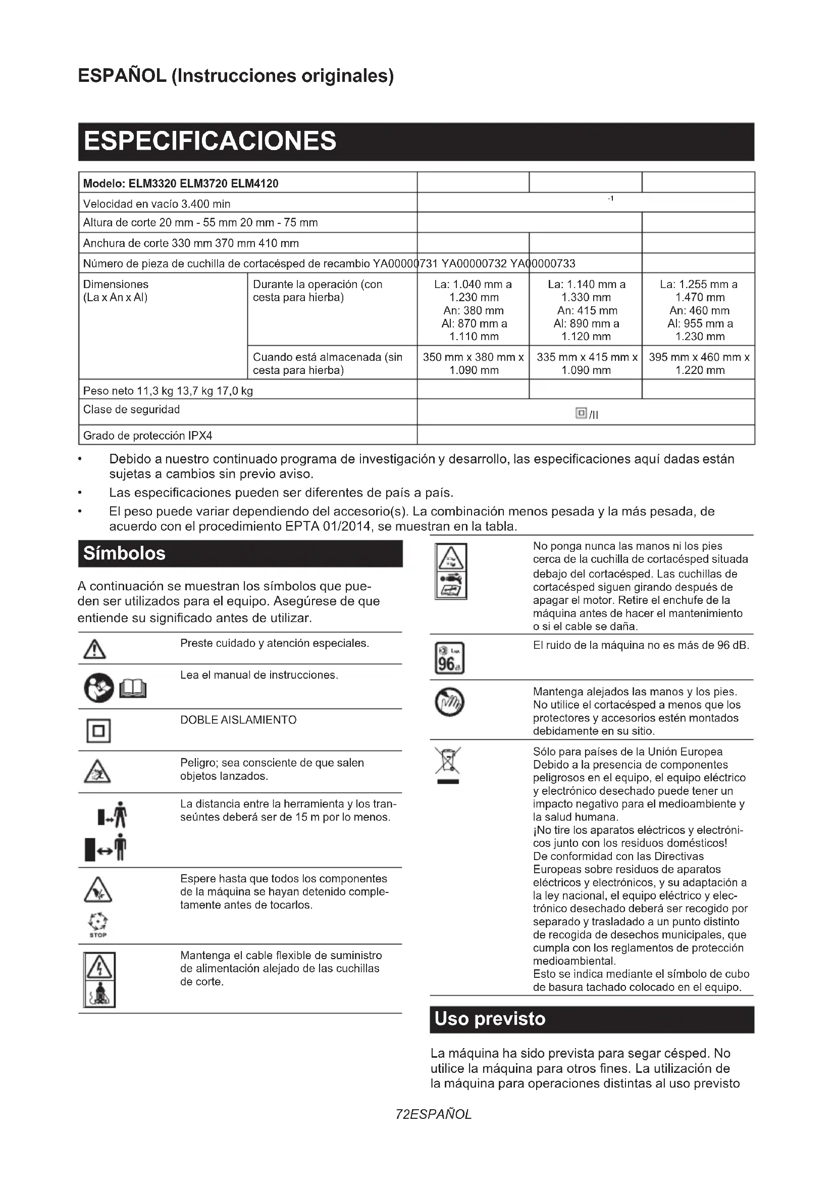 - El peso puede variar dependiendo del accesorio(s). La combinación menos pesada y la más pesada, de acuerdo con el procedimiento EPTA 01/2014, se muestran en la tabla. Símbolos A continuación se muestran los símbolos que pue- den ser utilizados para el equipo. Asegúrese de que entiendesusignicadoantesdeutilizar. Preste cuidado y atención especiales. Lea el manual de instrucciones. DOBLE AISLAMIENTO Peligro; sea consciente de que salen objetoslanzados. La distancia entre la herramienta y los tran- seúntes deberá ser de 15 m por lo menos. Espere hasta que todos los componentes de la máquina se hayan detenido comple- tamente antes de tocarlos. Mantengaelcableexibledesuministro dealimentaciónalejadodelascuchillas de corte. No ponga nunca las manos ni los pies cerca de la cuchilla de cortacésped situada debajodelcortacésped.Lascuchillasde cortacésped siguen girando después de apagar el motor. Retire el enchufe de la máquina antes de hacer el mantenimiento o si el cable se daña. El ruido de la máquina no es más de 96 dB. Mantengaalejadoslasmanosylospies. No utilice el cortacésped a menos que los protectores y accesorios estén montados debidamente en su sitio. Sólo para países de la Unión Europea Debido a la presencia de componentes peligrosos en el equipo, el equipo eléctrico y electrónico desechado puede tener un impacto negativo para el medioambiente y la salud humana. ¡No tire los aparatos eléctricos y electróni- cosjuntoconlosresiduosdomésticos! De conformidad con las Directivas Europeas sobre residuos de aparatos eléctricos y electrónicos, y su adaptación a la ley nacional, el equipo eléctrico y elec- trónico desechado deberá ser recogido por separado y trasladado a un punto distinto de recogida de desechos municipales, que cumpla con los reglamentos de protección medioambiental. Esto se indica mediante el símbolo de cubo de basura tachado colocado en el equipo. Uso previsto La máquina ha sido prevista para segar césped. No utilicelamáquinaparaotrosnes.Lautilizaciónde la máquina para operaciones distintas al uso previsto73 ESPAÑOL podrá resultar en una situación peligrosa. Alimentación La herramienta deberá ser conectada solamente a una fuente de alimentación de la misma tensión que la indicada en la placa de características, y solamente puede ser utilizada con alimentación de CA monofá- sica. La herramienta tiene doble aislamiento y puede, por lo tanto, utilizarse también en tomas de corriente sin conductor de tierra. Si el cable de suministro de alimentación se daña, deberá ser reemplazado por el fabricante o su agente de servicio para evitar un peligro. Para sistemas de distribución públicos de baja tensión de entre 220 V y 250 V Las operaciones del interruptor de aparatos eléctricos ocasionanuctuacionesenlatensión.Laoperaciónde este dispositivo en condiciones desfavorables de la red eléctrica puede tener efectos adversos en la operación de otros equipos. Con una impedancia de la red eléc- trica igual o menos de 0,425 ohmios (para ELM3720) o 0,427 ohmios (para ELM4120), se puede suponer que no habrá efectos negativos. La toma de corriente utili- zada para este dispositivo deberá estar protegida con un fusible o disyuntor protector que tenga unas caracte- rísticas de desconexión lenta. Ruido Estándar aplicable : EN IEC 62841-4-3 Modelo Nivel de presión del sonido Nivel de potencia del sonido