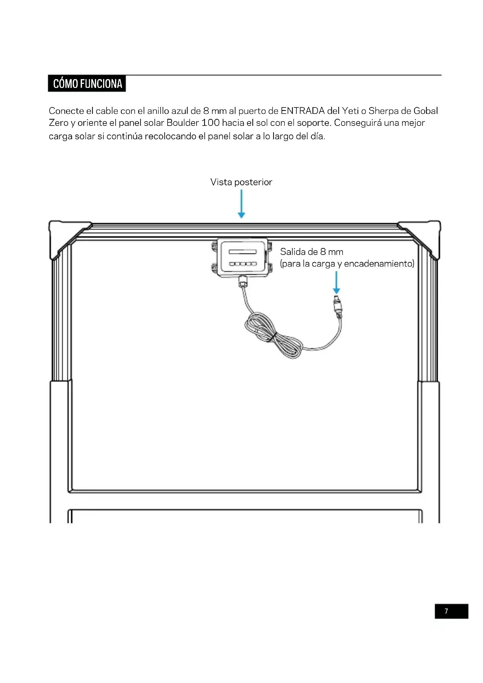 Conecte el cable con el anillo azul de 8 mm al puerto de ENTRADA del Yeti o Sherpa de Gobal Zero y oriente el panel solar Boulder 100 hacia el sol con el soporte. Conseguirá una mejor carga solar si continúa recolocando el panel solar a lo largo del día. Salida de 8 mm (para la carga y encadenamiento) Vista posterior8 Para encadenar los paneles solares Boulder 100, y para configuraciones del Boulder superiores a los 150 W, deberá comprar un cable combinado de Goal Zero. Póngase encontacto con el centro de soluciones del cliente para recibir asistencia sobre cuál es el cable adecuado para su configuración.