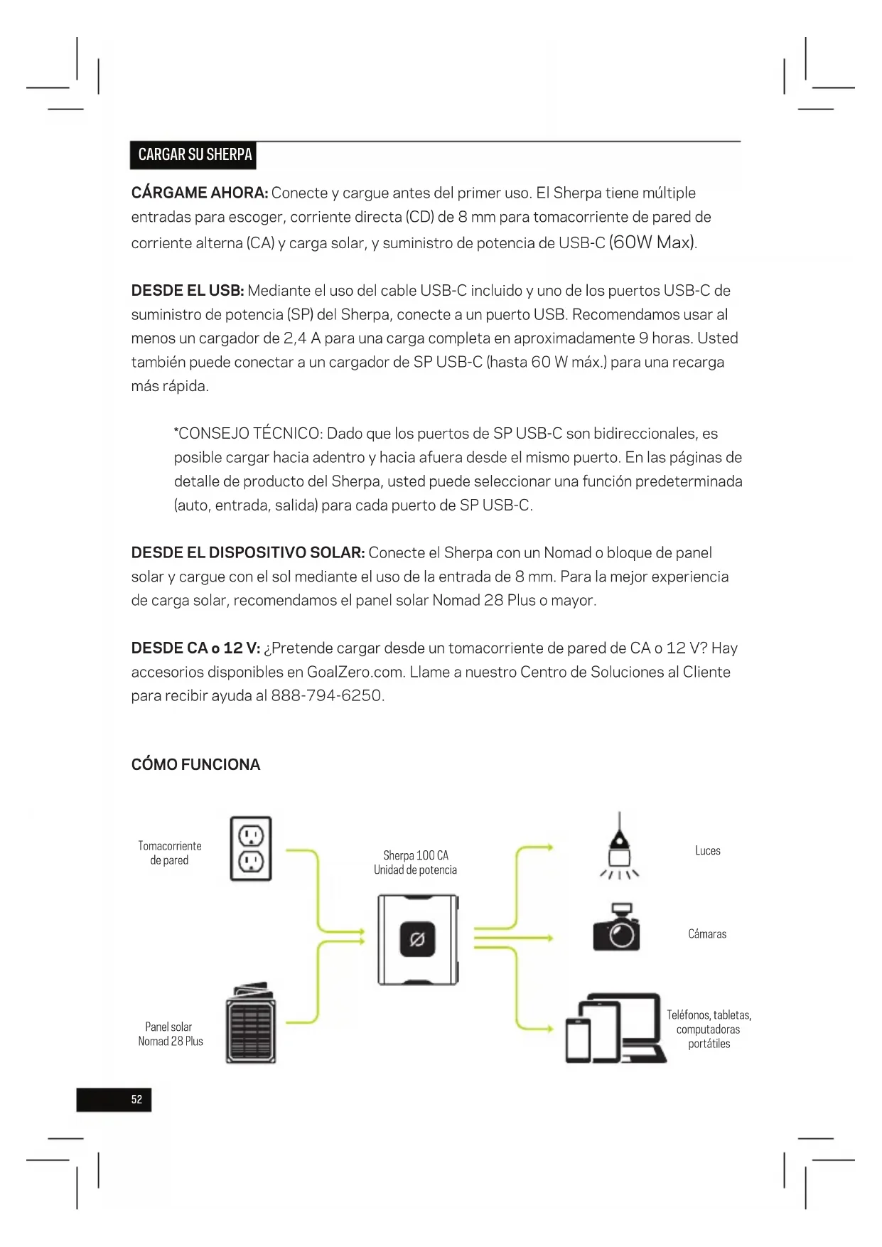 a USB-A Micro USB a USB-A USB-C a USB-A USB-C a USB-C52 CÁRGAME AHORA: Conecte y cargue antes del primer uso. El Sherpa tiene múltiple entradas para escoger, corriente directa (CD) de 8 mm para tomacorriente de pared de corriente alterna (CA) y carga solar, y suministro de potencia de USB-C (60W Max). DESDE EL USB: Mediante el uso del cable USB-C incluido y uno de los puertos USB-C de suministro de potencia (SP) del Sherpa, conecte a un puerto USB. Recomendamos usar al menos un cargador de 2,4 A para una carga completa en aproximadamente 9 horas. Usted también puede conectar a un cargador de SP USB-C (hasta 60 W máx.) para una recarga más rápida. *CONSEJO TÉCNICO: Dado que los puertos de SP USB-C son bidireccionales, es posible cargar hacia adentro y hacia afuera desde el mismo puerto. En las páginas de detalle de producto del Sherpa, usted puede seleccionar una función predeterminada (auto, entrada, salida) para cada puerto de SP USB-C. DESDE EL DISPOSITIVO SOLAR: Conecte el Sherpa con un Nomad o bloque de panel solar y cargue con el sol mediante el uso de la entrada de 8 mm. Para la mejor experiencia de carga solar, recomendamos el panel solar Nomad 28 Plus o mayor. DESDE CA o 12 V: ¿Pretende cargar desde un tomacorriente de pared de CA o 12 V? Hay accesorios disponibles en GoalZero.com. Llame a nuestro Centro de Soluciones al Cliente para recibir ayuda al 888-794-6250.