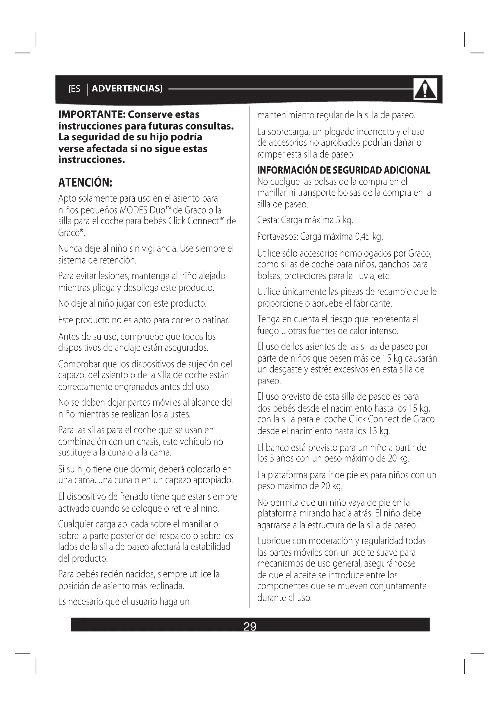 LIMPIEZA DEL COJÍN DEL ASIENTO. Limpie el cojín del asiento con un paño húmedo. SI UTILIZA LA SILLA DE PASEO en la playa, límpiela después por completo con el fin de eliminar la arena y la sal de los ensamblajes de las ruedas. COMPRUEBE DE VEZ EN CUANDO si la silla de paseo tiene algún tornillo suelto, si hay alguna pieza desgastada, alguna parte deshilachada o materiales defectuosos. Sustituya la pieza o repare el desperfecto, según sea necesario. DEJE DE UTILIZAR LA SILLA DE PASEO si resulta dañada o si se rompe. PARA LIMPIAR EL BASTIDOR DE LA SILLA DE PASEO, utilice exclusivamente un jabón doméstico y agua {ES ADVERTENCIAS} caliente. NO PUEDE USARSE LEJÍA, ALCOHOLES NI PRODUCTOS DE LIMPIEZA ABRASIVOS. Deje que se seque antes de guardarla. La burbuja de lluvia se ha de lavar a mano. NO UTILICE LEJÍA. El saco para la silla se ha de lavar a mano y dejar secar al aire. NO UTILICE LEJÍA. (en modelos seleccionados) UNA EXPOSICIÓN EXCESIVA AL SOL podría ocasionar una decoloración prematura de los plásticos y telas de la silla de paseo. Compruebe los diversos dispositivos de seguridad y utilícelos correctamente. Se deberá revisar la silla de paseo si transcurre un largo periodo sin utilizarla. Si alguien que no esté familiarizado con su funcionamiento, p. ej. los abuelos, va a utilizar la silla de paseo, muéstrele cómo funciona. El protector contra la lluvia deberá usarse bajo la supervisión de un adulto. No use la burbuja de lluvia en una silla de paseo o un asiento para el coche que no lleven la capota. No use la funda para la lluvia en interior, en una atmósfera caliente o cerca de una fuente de calor directa, ya que el bebé podría recalentarse. Retire la burbuja de lluvia por completo antes de plegar la silla de paseo. No suelte la silla de paseo cuando se encuentre cerca de carreteras o trenes, aunque tenga el freno accionado, el aire que desplaza el vehículo o tren puede mover una silla de paseo que no esté sujeta. Coja al niño y pliegue la silla de paseo siempre que vaya a subir o bajar escaleras o escaleras mecánicas. Evite el estrangulamiento. NO ate cordeles a la silla de paseo ni coloque objetos con cordeles sobre el niño. Para evitar los vuelcos, ayude siempre a su hijo al meterlo y sacarlo de una silla de paseo.31 {ES INSTRUCCIONES} Apertura de la estructura de la silla de paseo – consulte página 5, ilustraciones 1, 2, 3 Ruedas traseras – consulte página 5, ilustraciones 4, 5, 6, 7, 8, 9 Ruedas delanteras – consulte página 6, ilustraciones 1, 2 Banco – consulte página 6, ilustraciones 3, 4 Asiento para niños pequeños – consulte página 7, ilustraciones 1, 2 Capota – consulte página 7, imágenes 3, 4 Barra delantera – consulte página 8, ilustraciones 1, 2, 3, 4, 5 Soportes de jación de la silla para el coche/del asiento para niños pequeños – consulte página 8, ilustraciones 6, 7, 8 Soportes de posición delantera – consulte página 9, ilustraciones 1, 2 Uso del asiento para niños pequeños – consulte página 8, ilustraciones 3, 4, 5, 6, 7, 8 Retirada del asiento para niños pequeños – consulte página 10, ilustraciones 1, 2 Uso de la capota – consulte página 10, ilustraciones 3, 4, 5, 6 Cómo asegurar al niño – consulte página 11, ilustraciones 1, 2, 3, 4, 5, 6 Ajuste de la posición de la altura del arnés – consulte página 11, ilustraciones 7, 8 Elevación y reclinación del asiento – consulte página 12, ilustraciones 1, 2 Frenos – consulte página 13, ilustraciones 1, 2 Bloqueo de oscilación de las ruedas – consulte página 13, ilustraciones 3, 4 Acoplamiento y retirada de la silla para el coche para bebés Click Connect™ de Graco® a la posición trasera – consulte página 14, ilustraciones 1, 2, 3, 4, 5, 6 Acoplamiento y retirada de la silla para el coche para bebés Click Connect™ de Graco® a la posición delantera – consulte página 15, ilustraciones 1, 2, 3, 4, 5, 6 Plegado de una silla para paseo – consulte página 16, ilustraciones 1, 2, 3, 4, 5, 6 Saco – consulte página 17, ilustraciones 1, 2, 3, 4, 5 Fundas del arnés – consulte página 18, ilustración 1 Uso del protector contra la lluvia – consulte página 18, ilustraciones 2, 3, 4, 532 {PT AVISO} IMPORTANTE – Guarde estas instruções para referência futura. A segurança do seu bebé pode ser afetada caso não siga estas instruções. AVISO: Apenas compatível com um assento de bebé Graco MODES Duo™ ou uma cadeirinha para automóvel Graco® Click Connect™. Nunca deixe o bebé sem supervisão. Utilize sempre o sistema de retenção. Para evitar lesões, certifique-se de que o seu bebé está afastado quando abrir e fechar o produto. Não deixe o bebé brincar com o produto. Este produto não é adequado para correr ou andar de patins. Certifique-se de que todos os dispositivos de bloqueio estão acionados antes de utilizar. Verifique se alcofa, o assento reversível ou o assento auto estão correctamente encaixados antes de usar o produto. O bebé deverá estar afastado de todas as peças em movimento durante a realização de ajustes. Relativamente às cadeirinhas utilizadas em conjunto com uma base, este meio não substitui um berço ou uma cama. Se a criança tiver de dormir, deve colocá-la num carrinho, berço ou cama adequados. O travão deverá estar sempre accionado durante a colocação ou remoção do bebé do carrinho Qualquer tipo de carga colocada na pega e/ou na parte de trás do encosto e/ou nas partes laterais do veículo afeta a estabilidade do mesmo. No caso de recém-nascidos, utilize sempre a posição mais reclinada do assento. Este carrinho de passeio requer manutenção regular pelo utilizador. Sobrecarga, fecho incorreto e utilização de acessórios não aprovados poderão danificar ou partir este carrinho de passeio.