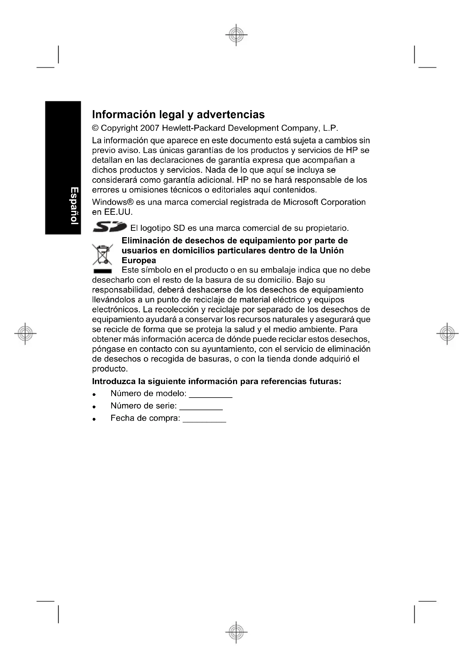 - Setzen Sie die Kamera in eine optionale HP Photosmart-Dockingstation ein, die mit Netzstrom versorgt wird, wenn Sie Bilder übertragen oder drucken. Weitere Informationen zu Batterien finden Sie unter www.hp.com/support. Suchen Sie nach dem Code AA-400 oder lesen Sie im Anhang A des elektronischen Benutzerhandbuchs nach. Kurzreferenz zur Kamera 25 Deutsch26 HP Photosmart M440/M540/M630 series DeutschHP Photosmart M440/M540/ M630 series EspañolInformación legal y advertencias © Copyright 2007 Hewlett-Packard Development Company, L.P. La información que aparece en este documento está sujeta a cambios sin previo aviso. Las únicas garantías de los productos y servicios de HP se detallan en las declaraciones de garantía expresa que acompañan a dichos productos y servicios. Nada de lo que aquí se incluya se considerará como garantía adicional. HP no se hará responsable de los errores u omisiones técnicos o editoriales aquí contenidos. Windows® es una marca comercial registrada de Microsoft Corporation en EE.UU. El logotipo SD es una marca comercial de su propietario. Eliminación de desechos de equipamiento por parte de usuarios en domicilios particulares dentro de la Unión Europea Este símbolo en el producto o en su embalaje indica que no debe desecharlo con el resto de la basura de su domicilio. Bajo su responsabilidad, deberá deshacerse de los desechos de equipamiento llevándolos a un punto de reciclaje de material eléctrico y equipos electrónicos. La recolección y reciclaje por separado de los desechos de equipamiento ayudará a conservar los recursos naturales y asegurará que se recicle de forma que se proteja la salud y el medio ambiente. Para obtener más información acerca de dónde puede reciclar estos desechos, póngase en contacto con su ayuntamiento, con el servicio de eliminación de desechos o recogida de basuras, o con la tienda donde adquirió el producto. Introduzca la siguiente información para referencias futuras: