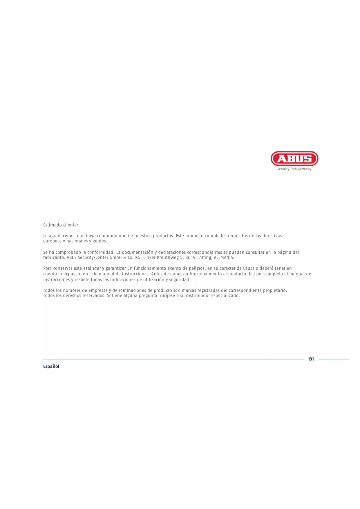 GRABADORA IP En esta guía rápida se describen los primeros pasos para instalar la grabadora IP. En el manual de instrucciones podrá consultar información más detallada.131 Español Estimado cliente: Le agradecemos que haya comprado uno de nuestros productos. Este producto cumple los requisitos de las directivas europeas y nacionales vigentes. Se ha comprobado la conformidad. La documentación y declaraciones correspondientes se pueden consultar en la página del fabricante. ABUS Security-Center GmbH & Co. KG, Linker Kreuthweg 5, 86444 Ang, ALEMANIA. Para conservar este estándar y garantizar un funcionamiento exento de peligros, en su carácter de usuario deberá tener en cuenta lo expuesto en este manual de instrucciones. Antes de poner en funcionamiento el producto, lea por completo el manual de instrucciones y respete todas las indicaciones de utilización y seguridad. Todos los nombres de empresas y denominaciones de producto son marcas registradas del correspondiente propietario. Todos los derechos reservados. Si tiene alguna pregunta, diríjase a su distribuidor especializado.132 Español
