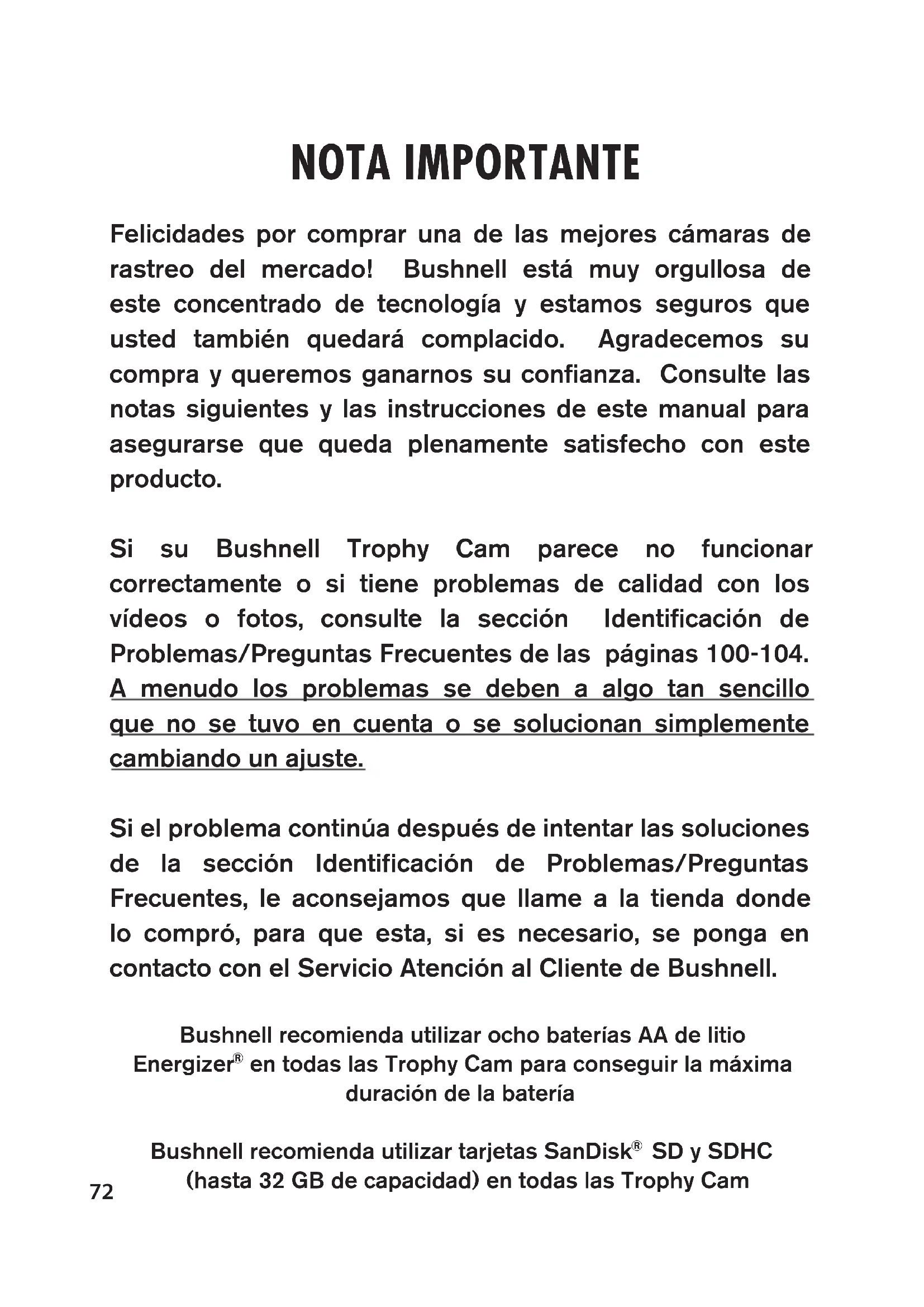 Modelo #: 119436 / 119446 / 119456Cat # 98-1517 / 4-11 ESPAñOL72 NOTA IMPOrTANTE Felicidades por comprar una de las mejores cámaras de rastreo del mercado! Bushnell está muy orgullosa de este concentrado de tecnología y estamos seguros que usted también quedará complacido. Agradecemos su compra y queremos ganarnos su confianza. Consulte las notas siguientes y las instrucciones de este manual para asegurarse que queda plenamente satisfecho con este producto. Si su Bushnell Trophy Cam parece no funcionar correctamente o si tiene problemas de calidad con los vídeos o fotos, consulte la sección Identificación de Problemas/Preguntas Frecuentes de las páginas 100-104. A menudo los problemas se deben a algo tan sencillo que no se tuvo en cuenta o se solucionan simplemente cambiando un ajuste. Si el problema continúa después de intentar las soluciones de la sección Identificación de Problemas/Preguntas Frecuentes, le aconsejamos que llame a la tienda donde lo compró, para que esta, si es necesario, se ponga en contacto con el Servicio Atención al Cliente de Bushnell. Bushnell recomienda utilizar ocho baterías AA de litio Energizer
