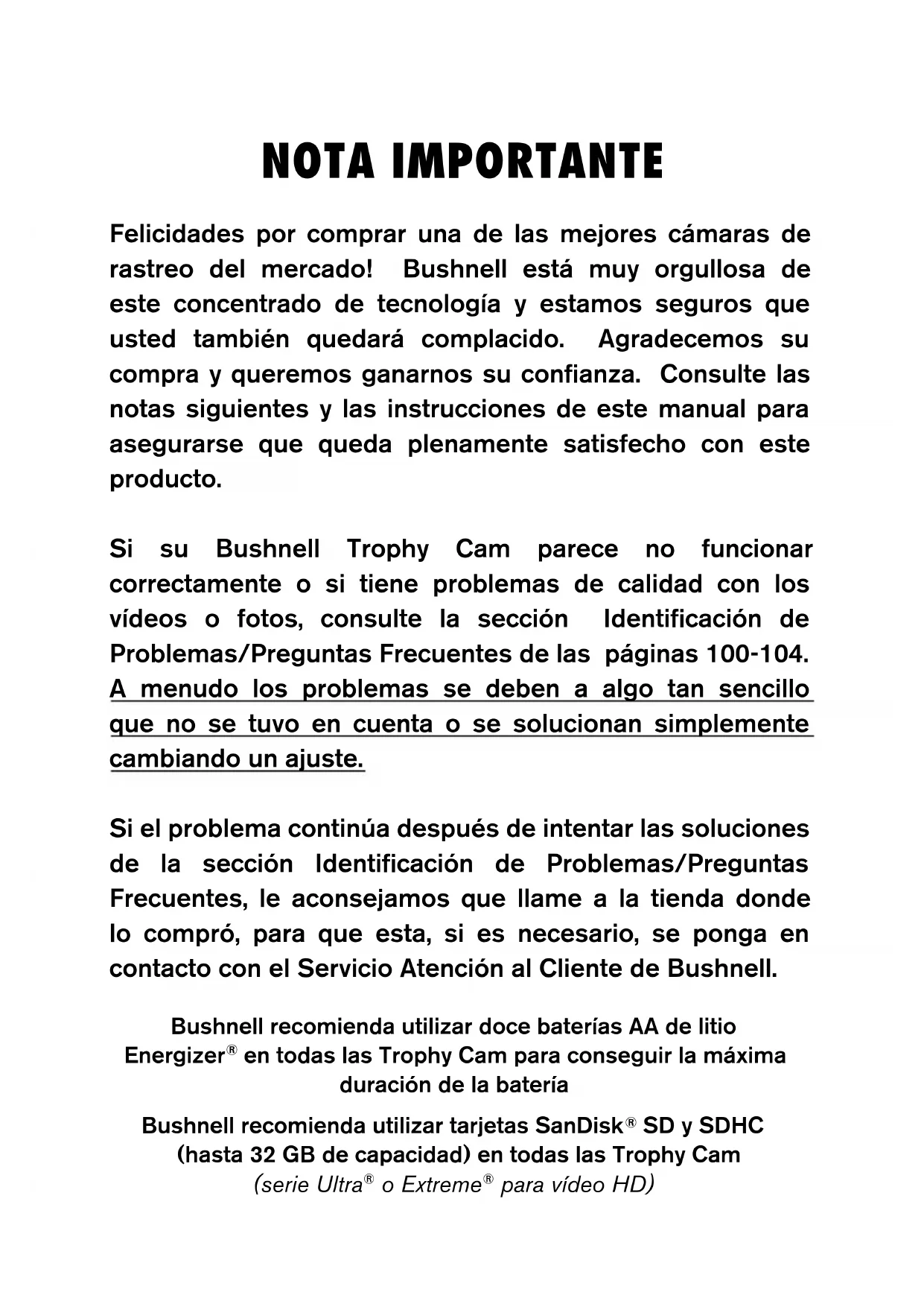 Modelo #: 119466 / 119467 Cat # 98-2019/ 4-11 ESPAñOL VIDEONOTA IMPORTANTE Felicidades por comprar una de las mejores cámaras de rastreo del mercado! Bushnell está muy orgullosa de este concentrado de tecnología y estamos seguros que usted también quedará complacido. Agradecemos su compra y queremos ganarnos su confianza. Consulte las notas siguientes y las instrucciones de este manual para asegurarse que queda plenamente satisfecho con este producto. Si su Bushnell Trophy Cam parece no funcionar correctamente o si tiene problemas de calidad con los vídeos o fotos, consulte la sección Identificación de Problemas/Preguntas Frecuentes de las páginas 100-104. A menudo los problemas se deben a algo tan sencillo que no se tuvo en cuenta o se solucionan simplemente cambiando un ajuste. Si el problema continúa después de intentar las soluciones de la sección Identificación de Problemas/Preguntas Frecuentes, le aconsejamos que llame a la tienda donde lo compró, para que esta, si es necesario, se ponga en contacto con el Servicio Atención al Cliente de Bushnell. Bushnell recomienda utilizar doce baterías AA de litio Energizer