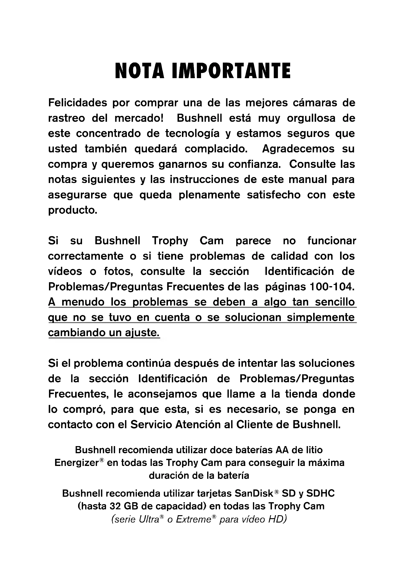 Modelo #: 119466 / 119467 Cat # 98-2019/ 4-11 ESPAñOL VIDEONOTA IMPORTANTE Felicidades por comprar una de las mejores cámaras de rastreo del mercado! Bushnell está muy orgullosa de este concentrado de tecnología y estamos seguros que usted también quedará complacido. Agradecemos su compra y queremos ganarnos su confianza. Consulte las notas siguientes y las instrucciones de este manual para asegurarse que queda plenamente satisfecho con este producto. Si su Bushnell Trophy Cam parece no funcionar correctamente o si tiene problemas de calidad con los vídeos o fotos, consulte la sección Identificación de Problemas/Preguntas Frecuentes de las páginas 100-104. A menudo los problemas se deben a algo tan sencillo que no se tuvo en cuenta o se solucionan simplemente cambiando un ajuste. Si el problema continúa después de intentar las soluciones de la sección Identificación de Problemas/Preguntas Frecuentes, le aconsejamos que llame a la tienda donde lo compró, para que esta, si es necesario, se ponga en contacto con el Servicio Atención al Cliente de Bushnell. Bushnell recomienda utilizar doce baterías AA de litio Energizer