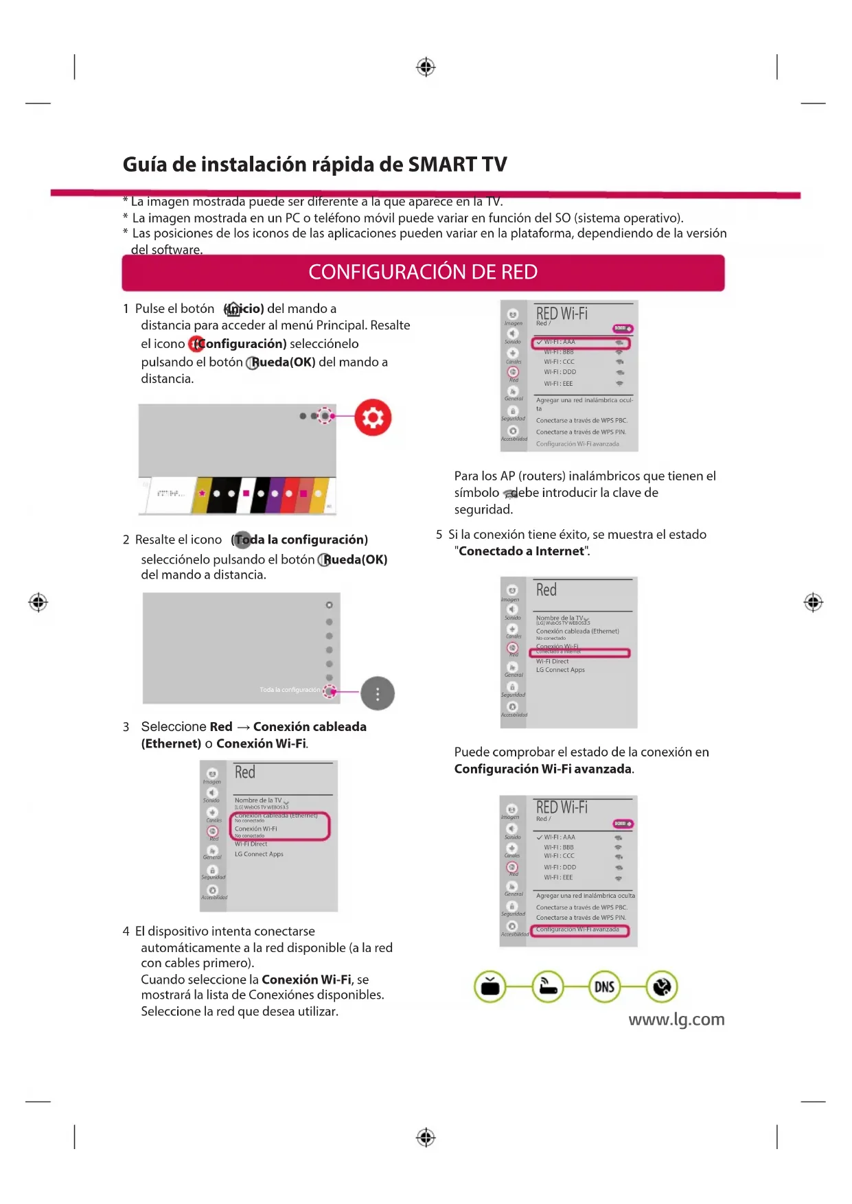 - Las posiciones de los iconos de las aplicaciones pueden variar en la plataforma, dependiendo de la versión del software. Guía de instalación rápida de SMART TV www.lg.comSolución de problemas de red 1 Pulse el botón (Inicio) del mando a distancia para acceder al menú Principal. Resalte el icono (Configuración) selecciónelo pulsando el botón Rueda(OK) del mando a distancia. 2 Resalte el icono (Toda la configuración) selecciónelo pulsando el botón Rueda(OK) del mando a distancia. Toda la configuración