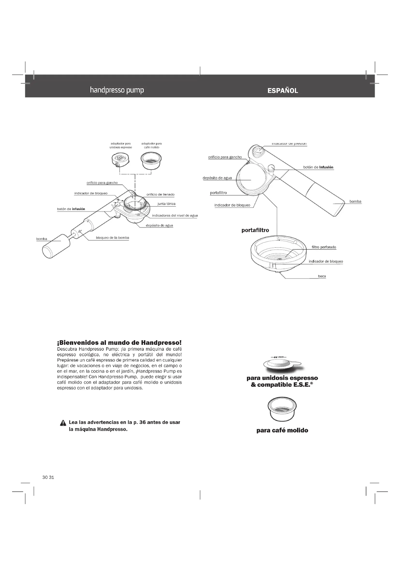 port afiltro boca filtro perforado indicador de bloqueo bomba botón de infusión indicador de presión depósito de agua orificio para gancho portafiltro indicador de bloqueo orificio de llenado junta tórica depósito de agua bloqueo de la bomba indicadores del nivel de agua bomba orificio para gancho indicador de bloqueo botón de infusión Lea las advertencias en la p. 36 antes de usar la máquina Handpresso. ¡Bienvenidos al mundo de Handpresso! Descubra Handpresso Pump: ¡la primera máquina de café espresso ecológica, no eléctrica y portátil del mundo! Prepárese un café espresso de primera calidad en cualquier lugar: de vacaciones o en viaje de negocios, en el campo o en el mar, en la cocina o en el jardín, ¡Handpresso Pump es indispensable! Con Handpresso Pump, puede elegir si usar café molido con el adaptador para café molido o unidosis espresso con el adaptador para unidosis. adaptador para café molido adaptador para unidosis espresso ESPAÑOL handpresso pump32 33 90°
