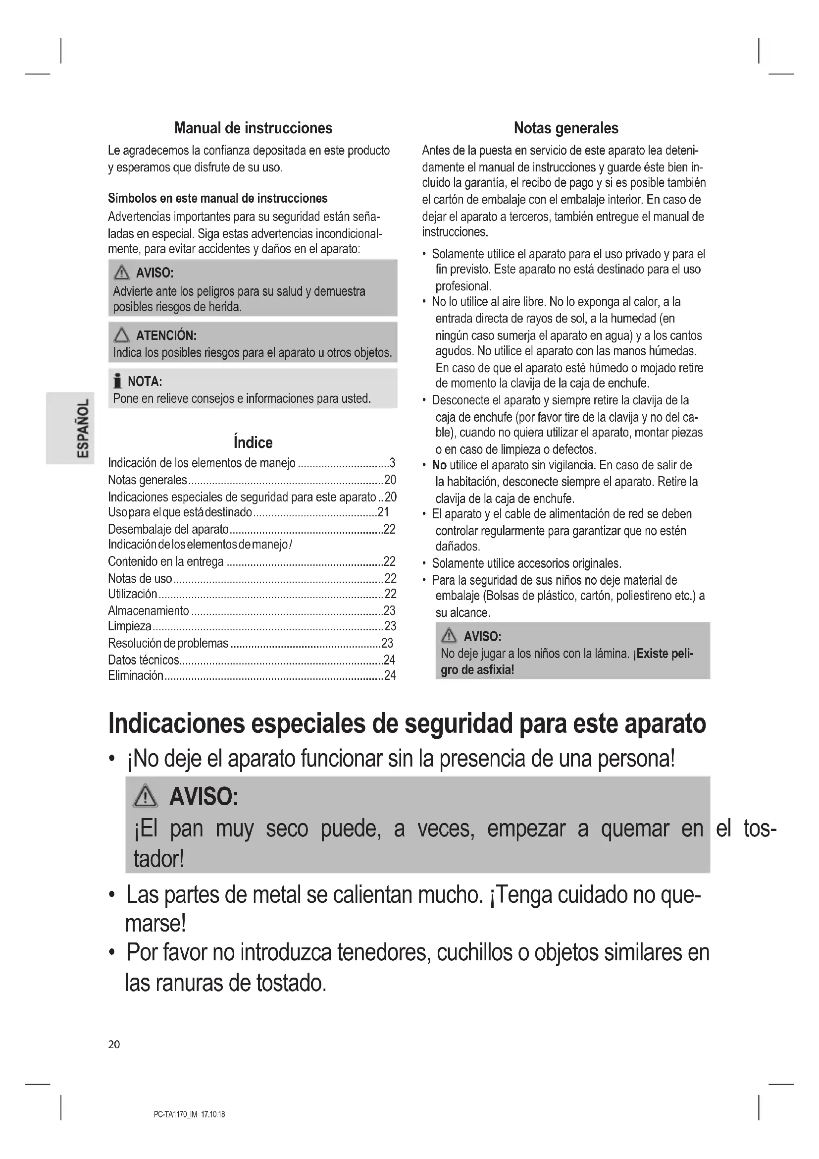 - Mantenga el aparato y el cable fuera del alcance de niños meno- res de 8 años. ATENCIÓN: Este aparato no está diseñado para sumergirlo en agua durante su limpieza. Siga las instrucciones que hemos incluido en el capí- tulo “Limpieza”. Uso para el que está destinado Este aparato está diseñado para tostar rebanadas de pan y bollos con el accesorio para tostar. El aparato está destinado al uso doméstico y a su uso en áreas similares. Sólo se puede utilizar en la forma descrita en este manual de instrucciones. El aparato no se puede utilizar con nes comerciales. Cualquier otro uso no se considera como el pretendido y puede dar lugar a daños materiales o incluso lesiones físicas. El fabricante no asume ninguna responsabilidad por daños que se puedan producir por un uso incorrecto.PC-TA1170_IM 17.10.18