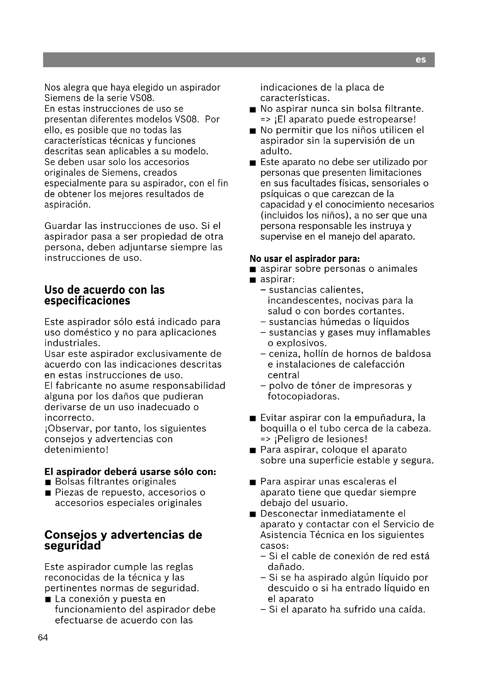 Nos alegra que haya elegido un aspirador Siemens de la serie VS08. En estas instrucciones de uso se presentan diferentes modelos VS08. Por ello, es posible que no todas las características técnicas y funciones descritas sean aplicables a su modelo. Se deben usar solo los accesorios originales de Siemens, creados especialmente para su aspirador, con el fin de obtener los mejores resultados de aspiración. Guardar las instrucciones de uso. Si el aspirador pasa a ser propiedad de otra persona, deben adjuntarse siempre las instrucciones de uso. Uso de acuerdo con las especificaciones Este aspirador sólo está indicado para uso doméstico y no para aplicaciones industriales. Usar este aspirador exclusivamente de acuerdo con las indicaciones descritas en estas instrucciones de uso. El fabricante no asume responsabilidad alguna por los daños que pudieran derivarse de un uso inadecuado o incorrecto. ¡Observar, por tanto, los siguientes consejos y advertencias con detenimiento! El aspirador deberá usarse sólo con: Bolsas filtrantes originales Piezas de repuesto, accesorios o accesorios especiales originales Consejos y advertencias de seguridad Este aspirador cumple las reglas reconocidas de la técnica y las pertinentes normas de seguridad. La conexión y puesta en funcionamiento del aspirador debe efectuarse de acuerdo con las indicaciones de la placa de características. No aspirar nunca sin bolsa filtrante. => ¡El aparato puede estropearse! No permitir que los niños utilicen el aspirador sin la supervisión de un adulto. Este aparato no debe ser utilizado por personas que presenten limitaciones en sus facultades físicas, sensoriales o psíquicas o que carezcan de la capacidad y el conocimiento necesarios (incluidos los niños), a no ser que una persona responsable les instruya y supervise en el manejo del aparato. No usar el aspirador para: aspirar sobre personas o animales aspirar: – sustancias calientes, incandescentes, nocivas para la salud o con bordes cortantes. – sustancias húmedas o líquidos – sustancias y gases muy inflamables o explosivos. – ceniza, hollín de hornos de baldosa e instalaciones de calefacción central – polvo de tóner de impresoras y fotocopiadoras. Evitar aspirar con la empuñadura, la boquilla o el tubo cerca de la cabeza. => ¡Peligro de lesiones! Para aspirar, coloque el aparato sobre una superficie estable y segura. Para aspirar unas escaleras el aparato tiene que quedar siempre debajo del usuario. Desconectar inmediatamente el aparato y contactar con el Servicio de Asistencia Técnica en los siguientes casos: – Si el cable de conexión de red está dañado. – Si se ha aspirado algún líquido por descuido o si ha entrado líquido en el aparato – Si el aparato ha sufrido una caída.65