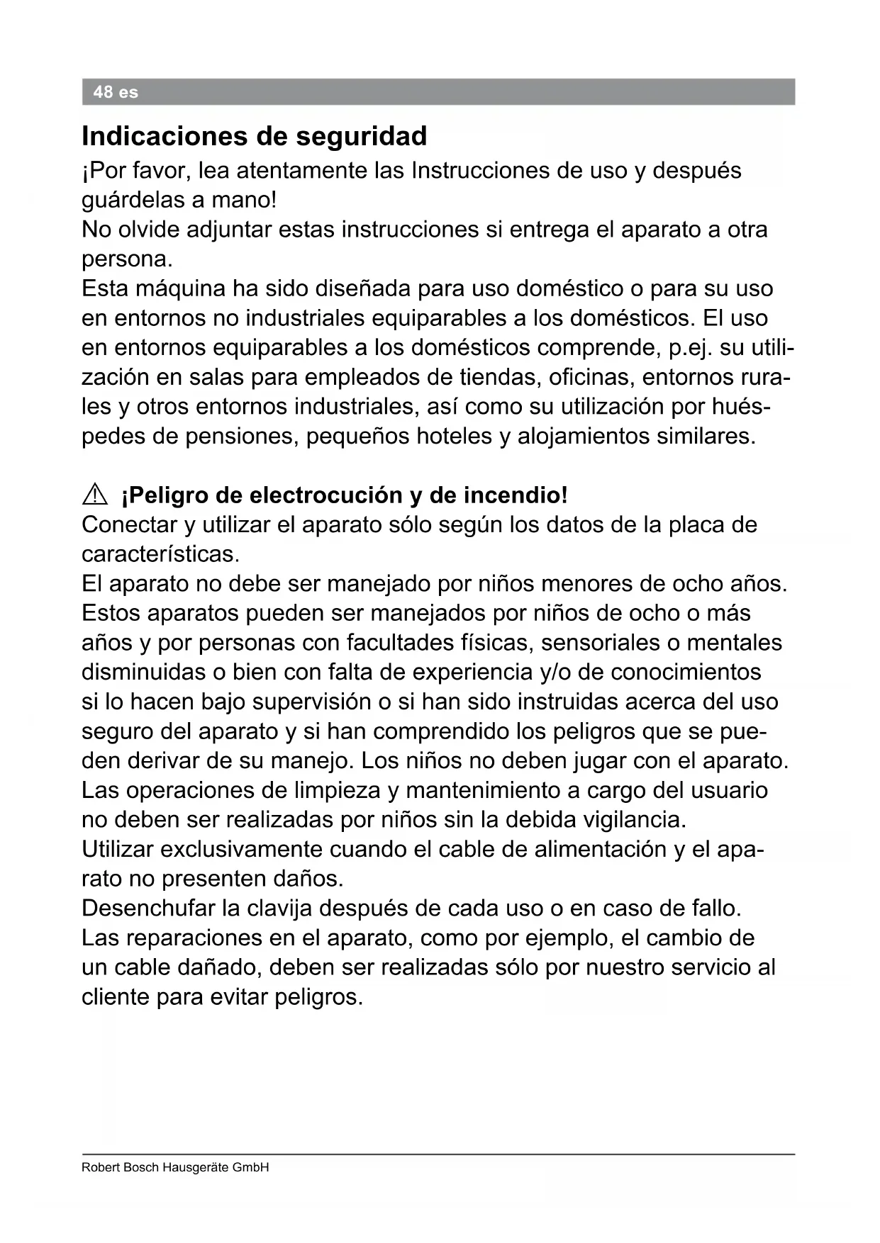 BOSCH se compromete a reparar o reponer de for ma gratuita durante un período de 24 me ses, a partir de la fecha de compra por el usuario nal, las piezas cuyo defecto o fal- ta de funcionamiento obedezca a causas de fabricación, así como la mano de obra ne cesaria para su reparación, siempre y cuando el aparato sea llevado por el usuario al taller del Servicio Técnico Autorizado por BOSCH. En el caso de que el usuario solicitara la vi sita del Técnico Autorizado a su domicilio para la reparación del aparato, estará obli- gado el usuario a pagar los gastos del des- plazamiento. Esta garantía no incluye: lámparas, crista- les, plásticos, ni piezas estéticas, reclama- das después del primer uso, ni averías pro- ducidas por causas ajenas a la fabricación o por uso no doméstico. Igualmente no están amparadas por esta garantía las averías o falta de funcionamiento producidas por cau- sas no imputables al aparato (ma nejo inade- cuado del mismo, limpiezas, voltajes e insta- lación incorrecta) o falta de seguimiento de las instrucciones de fun cio na miento y mante- nimiento que para cada aparato se incluyen en el folleto de instruc ciones. Para la efectividad de esta garantía es imprescindible acreditar por parte del usuario y ante el Servicio Autorizado de BOSCH, la fecha de adquisición mediante la correspon- diente FACTURA DE COMPRA que el usua- rio acompañará con el aparato cuando ante la eventualidad de una avería lo tenga que llevar al Taller Autorizado. La intervención en el aparato por personal ajeno al Servicio Técnico Autorizado por BOSCH, signica la pérdida de garantía.