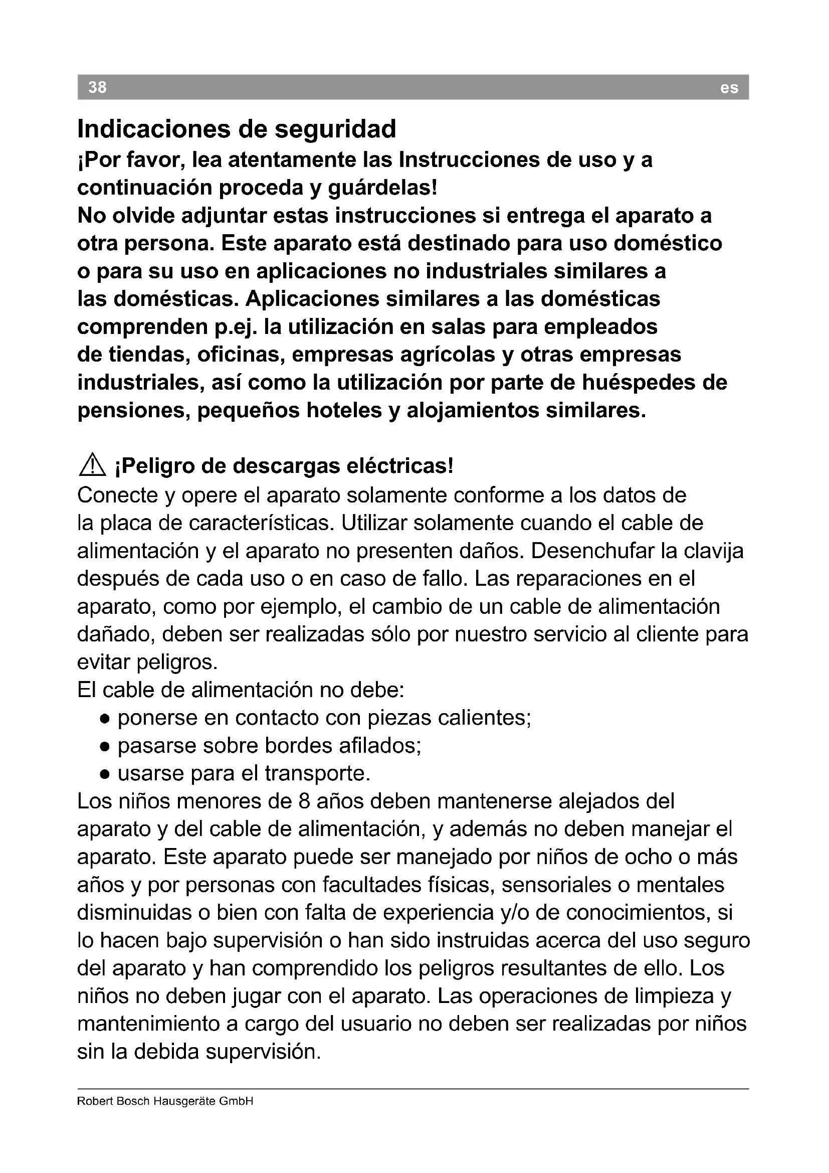 ¡Peligro de descargas eléctricas! Conecte y opere el aparato solamente conforme a los datos de la placa de características. Utilizar solamente cuando el cable de alimentación y el aparato no presenten daños. Desenchufar la clavija después de cada uso o en caso de fallo. Las reparaciones en el aparato, como por ejemplo, el cambio de un cable de alimentación dañado, deben ser realizadas sólo por nuestro servicio al cliente para evitar peligros. El cable de alimentación no debe: ● ponerse en contacto con piezas calientes; ● pasarse sobre bordes alados; ● usarse para el transporte. Los niños menores de 8 años deben mantenerse alejados del aparato y del cable de alimentación, y además no deben manejar el aparato. Este aparato puede ser manejado por niños de ocho o más años y por personas con facultades físicas, sensoriales o mentales disminuidas o bien con falta de experiencia y/o de conocimientos, si lo hacen bajo supervisión o han sido instruidas acerca del uso seguro del aparato y han comprendido los peligros resultantes de ello. Los niños no deben jugar con el aparato. Las operaciones de limpieza y mantenimiento a cargo del usuario no deben ser realizadas por niños sin la debida supervisión.39 TAT 3A.. 06/2013