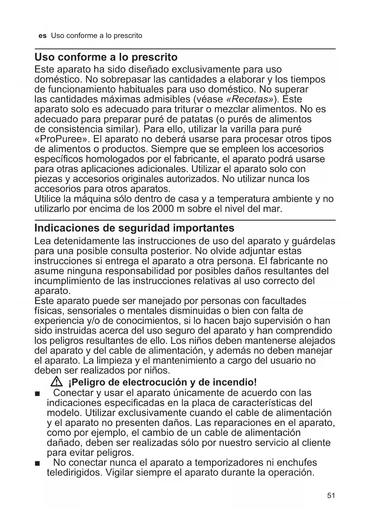 Hävitä pakkaus ympäristöystäväl- lisesti. Tämän laitteen merkintä perustuu käytettyjä sähkö- ja elektroniikkalaitteita (waste electrical and electronic equipment – WEEE) koskevaan direktiiviin 2012/19/EU. Tämä direktiivi määrittää käytettyjen laitteiden palautus- ja kierrätys-sään- nökset koko EU:n alueella. Tietoja oikeasta jätehuollosta saa myyjältä tai kunnalliselta jäteneuvojalta. Takuu Tälle laitteelle ovat voimassa maahantuojan myöntämät takuuehdot. Täydelliset takuue- hdot saat myyntiliikkeeltä, josta olet ostanut laitteen. Takuutapauksessa on näytettävä ostokuitti. Oikeus muutoksiin pidätetään.51 es Uso conforme a lo prescrito Uso conforme a lo prescrito Este aparato ha sido diseñado exclusivamente para uso doméstico. No sobrepasar las cantidades a elaborar y los tiempos de funcionamiento habituales para uso doméstico. No superar las cantidades máximas admisibles (véase «Recetas»). Este aparato solo es adecuado para triturar o mezclar alimentos. No es adecuado para preparar puré de patatas (o purés de alimentos de consistencia similar). Para ello, utilizar la varilla para puré «ProPuree». El aparato no deberá usarse para procesar otros tipos de alimentos o productos. Siempre que se empleen los accesorios específicos homologados por el fabricante, el aparato podrá usarse para otras aplicaciones adicionales. Utilizar el aparato solo con piezas y accesorios originales autorizados. No utilizar nunca los accesorios para otros aparatos. Utilice la máquina sólo dentro de casa y a temperatura ambiente y no utilizarlo por encima de los 2000 m sobre el nivel del mar. Indicaciones de seguridad importantes Lea detenidamente las instrucciones de uso del aparato y guárdelas para una posible consulta posterior. No olvide adjuntar estas instrucciones si entrega el aparato a otra persona. El fabricante no asume ninguna responsabilidad por posibles daños resultantes del incumplimiento de las instrucciones relativas al uso correcto del aparato. Este aparato puede ser manejado por personas con facultades físicas, sensoriales o mentales disminuidas o bien con falta de experiencia y/o de conocimientos, si lo hacen bajo supervisión o han sido instruidas acerca del uso seguro del aparato y han comprendido los peligros resultantes de ello. Los niños deben mantenerse alejados del aparato y del cable de alimentación, y además no deben manejar el aparato. La limpieza y el mantenimiento a cargo del usuario no deben ser realizados por niños. W ¡Peligro de electrocución y de incendio! Ŷ Conectar y usar el aparato únicamente de acuerdo con las indicaciones especificadas en la placa de características del modelo. Utilizar exclusivamente cuando el cable de alimentación y el aparato no presenten daños. Las reparaciones en el aparato, como por ejemplo, el cambio de un cable de alimentación dañado, deben ser realizadas sólo por nuestro servicio al cliente para evitar peligros. Ŷ No conectar nunca el aparato a temporizadores ni enchufes teledirigidos. Vigilar siempre el aparato durante la operación.52 es Indicaciones de seguridad importantes Ŷ No coloque el aparato sobre o cerca de superficies calientes, como p. ej. placas eléctricas. Ŷ No sumergir nunca la unidad motriz en líquidos. No lavarla debajo del grifo de agua ni tampoco en el lavavajillas. ¡No utilizar limpiadoras de vapor! No usar el aparato con las manos húmedas. Ŷ Está prohibido continuar utilizando el aparato si se cae dentro del agua o de otro líquido. Ŷ ¡Sumergir el pie de la batidora en los alimentos como máximo hasta la marca Í, de lo contrario existe peligro de descarga eléctrica! Ŷ El aparato debe desconectarse siempre de la red eléctrica después de cada uso, cuando se vaya a dejar sin vigilancia, antes del montaje, desmontaje o limpieza y en caso de avería. W ¡Peligro de lesiones! Ŷ El aparato debe desconectarse siempre de la red eléctrica después de cada uso, cuando se vaya a dejar sin vigilancia, antes del montaje, desmontaje o limpieza y en caso de avería. Ŷ Tras desconectar el aparato, el accionamiento del mismo continúa girando durante unos instantes. Esperar a que el accionamiento se detenga completamente. Ŷ No tocar nunca la cuchilla. No limpiar nunca la cuchilla con las manos sin protección. W ¡Peligro de quemaduras!