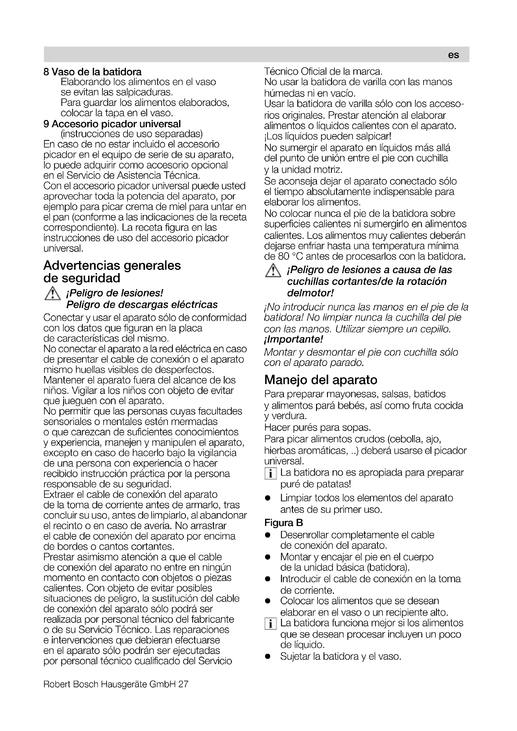 Oikeudet muutoksiin pidätetään. båÜçê~ÄìÉå~=éçê=ä~=Åçãéê~=ÇÉ=ëì=åìÉîç= ~é~ê~íç=ÇÉ=ä~= Å~ë~=_lp`eK `çå=¨äI=sÇK=ëÉ=Ü~=ÇÉÅáÇáÇç=éçê=ìå=ÉäÉÅíêçJ Ççã¨ëíáÅç=ãçÇÉêåç=ó=ÇÉ=Öê~å=Å~äáÇ~ ÇK j•ë=áåÑçêã~ÅáçåÉë=ëçÄêÉ=åìÉëíêçë= éêçÇìÅíçë=ä~ë=éçÇê•=Ü~ää~ê=Éå=åìÉëíê~= é•Öáå~=ïÉÄK esRobert Bosch Hausgeräte GmbH 27 8 Vaso de la batidora Elaborando los alimentos en el vaso se evitan las salpicaduras. Para guardar los alimentos elaborados, colocar la tapa en el vaso. 9 Accesorio picador universal (instrucciones de uso separadas) En caso de no estar incluido el accesorio picador en el equipo de serie de su aparato, lo puede adquirir como accesorio opcional en el Servicio de Asistencia Técnica. Con el accesorio picador universal puede usted aprovechar toda la potencia del aparato, por ejemplo para picar crema de miel para untar en el pan (conforme a las indicaciones de la receta correspondiente). La receta figura en las instrucciones de uso del accesorio picador universal. Advertencias generales de seguridad flmÉäáÖêç=ÇÉ=äÉëáçåÉë> mÉäáÖêç=ÇÉ=ÇÉëÅ~êÖ~ë=Éä¨ÅíêáÅ~ë Conectar y usar el aparato sólo de conformidad con los datos que figuran en la placa de características del mismo. No conectar el aparato a la red eléctrica en caso de presentar el cable de conexión o el aparato mismo huellas visibles de desperfectos. Mantener el aparato fuera del alcance de los niños. Vigilar a los niños con objeto de evitar que jueguen con el aparato. No permitir que las personas cuyas facultades sensoriales o mentales estén mermadas o que carezcan de suficientes conocimientos y experiencia, manejen y manipulen el aparato, excepto en caso de hacerlo bajo la vigilancia de una persona con experiencia o hacer recibido instrucción práctica por la persona responsable de su seguridad. Extraer el cable de conexión del aparato de la toma de corriente antes de armarlo, tras concluir su uso, antes de limpiarlo, al abandonar el recinto o en caso de avería. No arrastrar el cable de conexión del aparato por encima de bordes o cantos cortantes. Prestar asimismo atención a que el cable de conexión del aparato no entre en ningún momento en contacto con objetos o piezas calientes. Con objeto de evitar posibles situaciones de peligro, la sustitución del cable de conexión del aparato sólo podrá ser realizada por personal técnico del fabricante o de su Servicio Técnico. Las reparaciones e intervenciones que debieran efectuarse en el aparato sólo podrán ser ejecutadas por personal técnico cualificado del Servicio Técnico Oficial de la marca. No usar la batidora de varilla con las manos húmedas ni en vacío. Usar la batidora de varilla sólo con los acceso- rios originales. Prestar atención al elaborar alimentos o líquidos calientes con el aparato. ¡Los líquidos pueden salpicar! No sumergir el aparato en líquidos más allá del punto de unión entre el pie con cuchilla y la unidad motriz. Se aconseja dejar el aparato conectado sólo el tiempo absolutamente indispensable para elaborar los alimentos. No colocar nunca el pie de la batidora sobre superficies calientes ni sumergirlo en alimentos calientes. Los alimentos muy calientes deberán dejarse enfriar hasta una temperatura mínima de 80 °C antes de procesarlos con la batidora. flmÉäáÖêç=ÇÉ=äÉëáçåÉë=~=Å~ìë~=ÇÉ=ä~ë= ÅìÅÜáää~ë=Åçêí~åíÉëLÇÉ=ä~=êçí~Åáμå= ÇÉä ãçíçê> flkç=áåíêçÇìÅáê=åìåÅ~=ä~ë=ã~åçë=Éå=Éä=éáÉ=ÇÉ=ä~= Ä~íáÇçê~>=kç=äáãéá~ê=åìåÅ~=ä~=ÅìÅÜáää~=ÇÉä=éáÉ= Åçå=ä~ë=ã~åçëK=ríáäáò~ê=ëáÉãéêÉ=ìå=ÅÉéáääçK flfãéçêí~åíÉ> jçåí~ê=ó=ÇÉëãçåí~ê=Éä=éáÉ=Åçå=ÅìÅÜáää~=ëμäç= Åçå=Éä=~é~ê~íç =é~ê~ÇçK Manejo del aparato Para preparar mayonesas, salsas, batidos y alimentos pará bebés, así como fruta cocida y verdura. Hacer purés para sopas. Para picar alimentos crudos (cebolla, ajo, hierbas aromáticas, ..) deberá usarse el picador universal. La batidora no es apropiada para preparar puré de patatas! Limpiar todos los elementos del aparato antes de su primer uso. Figura B Desenrollar completamente el cable de conexión del aparato. Montar y encajar el pie en el cuerpo de la unidad básica (batidora). Introducir el cable de conexión en la toma de corriente. Colocar los alimentos que se desean elaborar en el vaso o un recipiente alto. La batidora funciona mejor si los alimentos que se desean procesar incluyen un poco de líquido. Sujetar la batidora y el vaso. es28 Robert Bosch Hausgeräte GmbH Conectar la batidora accionando la tecla correspondiente a la velocidad de trabajo (normal/turbo) deseada. Por regla general se aconseja usar el escalón turbo para procesar los alimentos. Para procesar líquidos y alimentos calientes, usar la velocidad de trabajo normal. La batidora está conectada mientras se esté pulsando la tecla de conexión. Para impedir que se produzcan salpica- duras durante la elaboración de los alimen- tos, pulsar la tecla de conexión sólo una vez que se ha sumergido el pie del aparato en los alimentos que se van a elaborar en el vaso. Desconectar siempre la batidora antes de extraerla del alimento elaborado. Tras concluir el trabajo, soltar la tecla de conexión. Extraer el cable de conexión de la toma de corriente. Pulsar las teclas de desbloqueo y retirar el pie de la base motriz. Tras concluir el trabajo/Limpieza del aparato fl^íÉåÅáμå> flkç=ëìãÉêÖáê=ä~=Ä~ëÉ=ãçíêáò=Éå=Éä=~Öì~ >= flkç ä~î~ê=åìåÅ~=ä~=Ä~ëÉ=ãçíêáò=Éå=Éä= ä~î~î~àáää~ë>= flkç=ìíáäáò~ê=åìåÅ~=ìå~=äáãéá~Ççê~=ÇÉ=î~éçê> fli~ë=ëìéÉêÑáÅáÉë=ÇÉä=~é~ê~íç=éìÉÇÉå=êÉëìäí~ê= Ç~¥~Ç~ë>=kç=ìë~ê=~