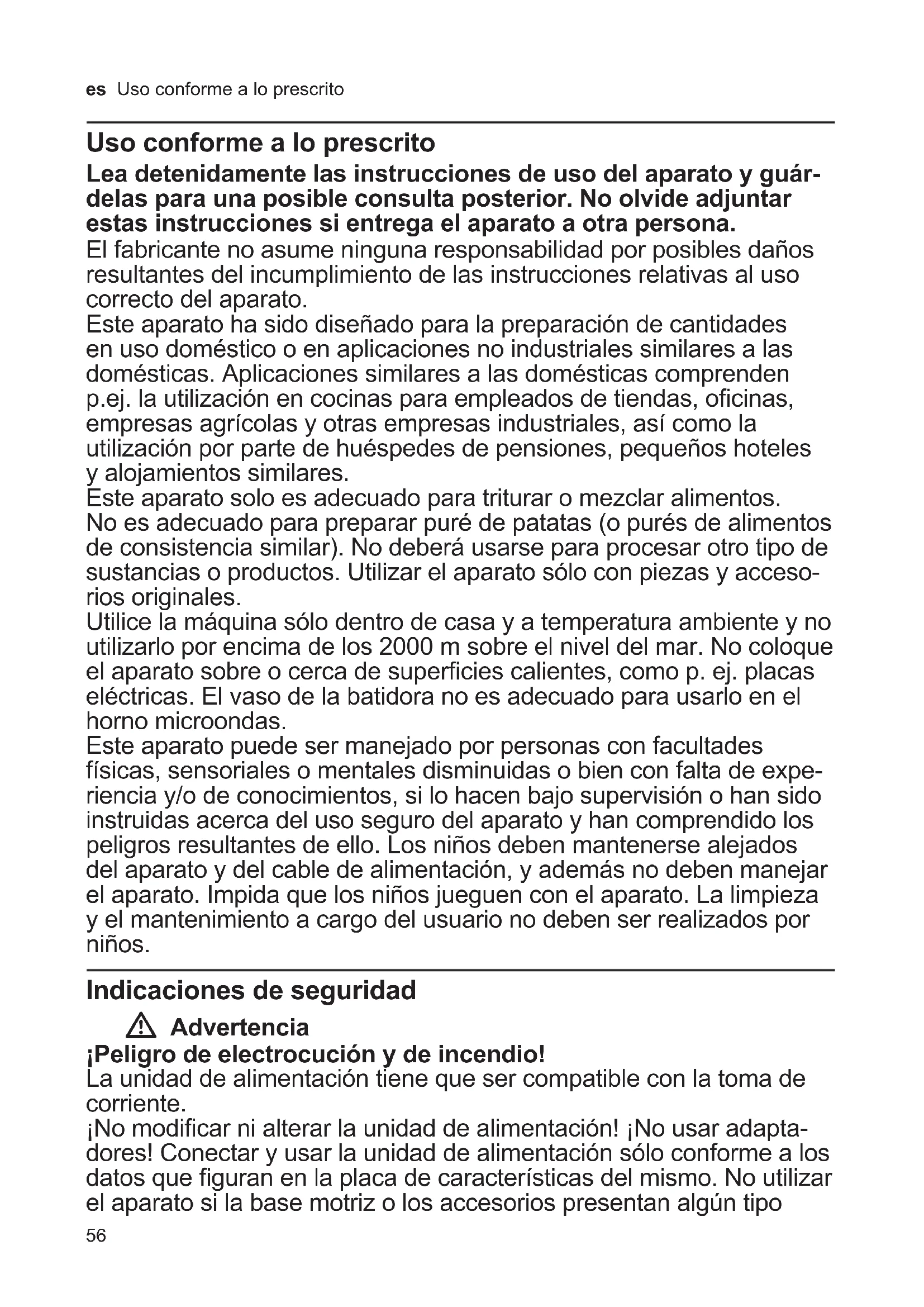 - Indicaciones de seguridad de daño. Para evitar posibles peligros, sólo personal del servicio de asistencia técnica podrá realizar las reparaciones del aparato y sus accesorios. Sólo el servicio de asistencia técnica podrá sustituir las baterías. Enviar únicamente aparatos completos, no desmontados, con las baterías en perfecto estado mecánico. No extraer nunca las baterías para enviarlas por separado. Vigilar siempre el aparato durante la operación. Evitar que el cable de conexión del aparato entre en contacto con piezas calientes y cantos alados. No sumergir nunca la base motriz, la estación de carga y la unidad de alimentación en agua ni lavarlas en el lavavajillas. No utilizar nunca el aparato con las manos húmedas ni hacerlo funcionar en vacío. No sumergir el aparato en los alimentos más allá del punto de unión entre el pie de la batidora y la unidad motriz. La unidad de alimentación debe desconectarse siempre de la red eléctrica cuando no vaya a utilizarse durante un tiempo prolongado, cuando las baterías estén completamente cargadas, antes del montaje, del desmontaje o la limpieza y en caso de avería. Cargar la base motriz sólo en la estación de carga y con la unidad de alimenta- ción suministrada con el aparato. No cubrir la unidad de alimentación. Mantener alejados de la unidad de alimentación los objetos fácil- mente inamables. W Advertencia Peligro de explosión Proteger las baterías contra el calor y el fuego. W Advertencia Peligro de lesiones Después de utilizar el aparato, esperar a que la cuchilla se detenga. Antes de cambiar accesorios o piezas adicionales que se muevan durante el servicio, apagar el aparato. No tocar nunca la cuchilla. No limpiar nunca la cuchilla con las manos sin protección. En caso de uso incorrecto del aparato, puede salir líquido de la batería en la unidad motriz. ¡Evite el contacto con él! W Advertencia ¡Peligro de quemaduras Tenga cuidado al trabajar con alimentos calientes. Los alimentos calientes podrían salpicar. No colocar nunca el pie de la batidora sobre supercies calientes ni procesar con él tampoco alimentos muy calientes. Los alimentos que estén hirviendo deberán dejarse enfriar hasta una temperatura mínima de 80 °C antes de procesarlos. En caso de usar la batidora en el interior de una cacerola, retirar primero la cacerola de la zona de cocción.58 es Indicaciones de seguridad W Advertencia Peligro de asxia No deje que los niños jueguen con el embalaje. Contenido Enhorabuena por la compra de su nuevo aparato de la casa Bosch. En las siguientes páginas de estas instruc- ciones de uso encontrará indicaciones útiles para un manejo seguro del aparato. Le rogamos que lea detenidamente estas instrucciones y siga todas las indicaciones. De este modo, podrá sacar el mayor prove- cho del aparato y obtendrá tan buenos resul- tados que estará seguro de haber realizado la mejor compra. Conserve estas instrucciones de uso por si necesita consultarlas más tarde o entregár- selas al siguiente propietario. En nuestra página web encontrará más información sobre nuestros productos. Uso conforme a lo prescrito p. 56
