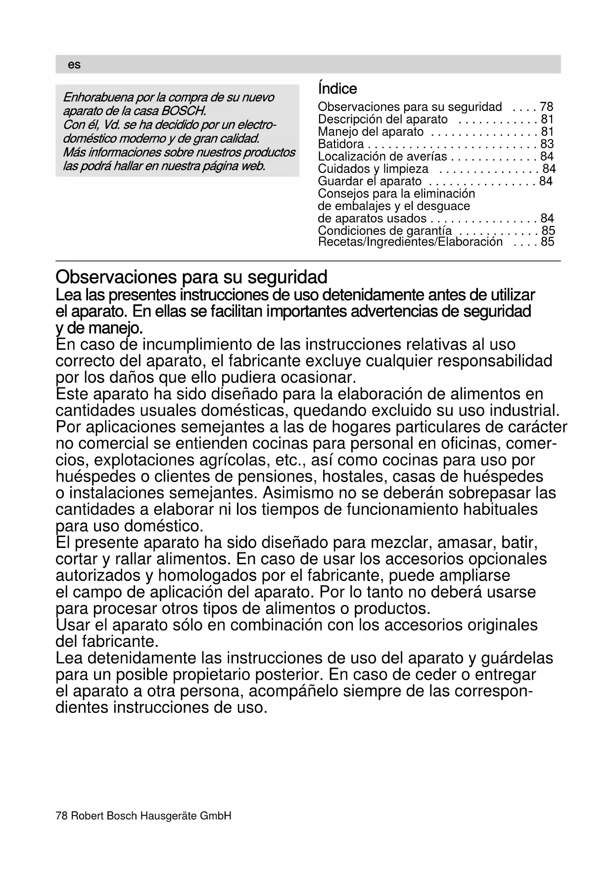 - Recetas/Ingredientes/Elaboración Observaciones para su seguridad Lea las presentes instrucciones de uso detenidamente antes de utilizar el aparato. En ellas se facilitan importantes advertencias de seguridad y de manejo. En caso de incumplimiento de las instrucciones relativas al uso correcto del aparato, el fabricante excluye cualquier responsabilidad por los daños que ello pudiera ocasionar. Este aparato ha sido diseñado para la elaboración de alimentos en cantidades usuales domésticas, quedando excluido su uso industrial. Por aplicaciones semejantes a las de hogares particulares de carácter no comercial se entienden cocinas para personal en oficinas, comer- cios, explotaciones agrícolas, etc., así como cocinas para uso por huéspedes o clientes de pensiones, hostales, casas de huéspedes o instalaciones semejantes. Asimismo no se deberán sobrepasar las cantidades a elaborar ni los tiempos de funcionamiento habituales para uso doméstico. El presente aparato ha sido diseñado para mezclar, amasar, batir, cortar y rallar alimentos. En caso de usar los accesorios opcionales autorizados y homologados por el fabricante, puede ampliarse el campo de aplicación del aparato. Por lo tanto no deberá usarse para procesar otros tipos de alimentos o productos. Usar el aparato sólo en combinación con los accesorios originales del fabricante. Lea detenidamente las instrucciones de uso del aparato y guárdelas para un posible propietario posterior. En caso de ceder o entregar el aparato a otra persona, acompáñelo siempre de las correspon- dientes instrucciones de uso. p. 85