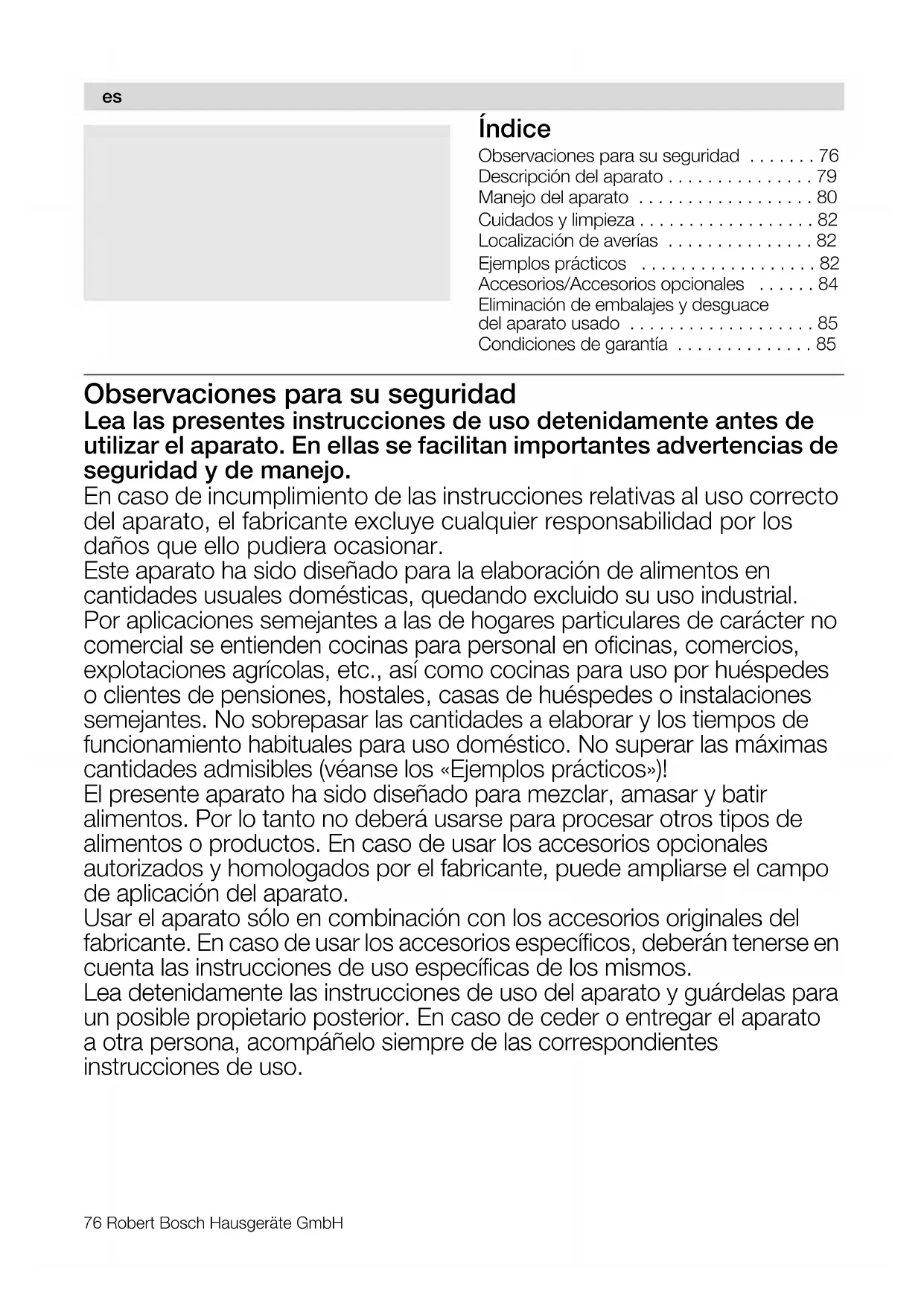 - Condiciones de garantía Observaciones para su seguridad Lea las presentes instrucciones de uso detenidamente antes de utilizar el aparato. En ellas se facilitan importantes advertencias de seguridad y de manejo. En caso de incumplimiento de las instrucciones relativas al uso correcto del aparato, el fabricante excluye cualquier responsabilidad por los daños que ello pudiera ocasionar. Este aparato ha sido diseñado para la elaboración de alimentos en cantidades usuales domésticas, quedando excluido su uso industrial. Por aplicaciones semejantes a las de hogares particulares de carácter no comercial se entienden cocinas para personal en oficinas, comercios, explotaciones agrícolas, etc., así como cocinas para uso por huéspedes o clientes de pensiones, hostales, casas de huéspedes o instalaciones semejantes. No sobrepasar las cantidades a elaborar y los tiempos de funcionamiento habituales para uso doméstico. No superar las máximas cantidades admisibles (véanse los «Ejemplos prácticos»)! El presente aparato ha sido diseñado para mezclar, amasar y batir alimentos. Por lo tanto no deberá usarse para procesar otros tipos de alimentos o productos. En caso de usar los accesorios opcionales autorizados y homologados por el fabricante, puede ampliarse el campo de aplicación del aparato. Usar el aparato sólo en combinación con los accesorios originales del fabricante. En caso de usar los accesorios específicos, deberán tenerse en cuenta las instrucciones de uso específicas de los mismos. Lea detenidamente las instrucciones de uso del aparato y guárdelas para un posible propietario posterior. En caso de ceder o entregar el aparato a otra persona, acompáñelo siempre de las correspondientes instrucciones de uso. p. 85
