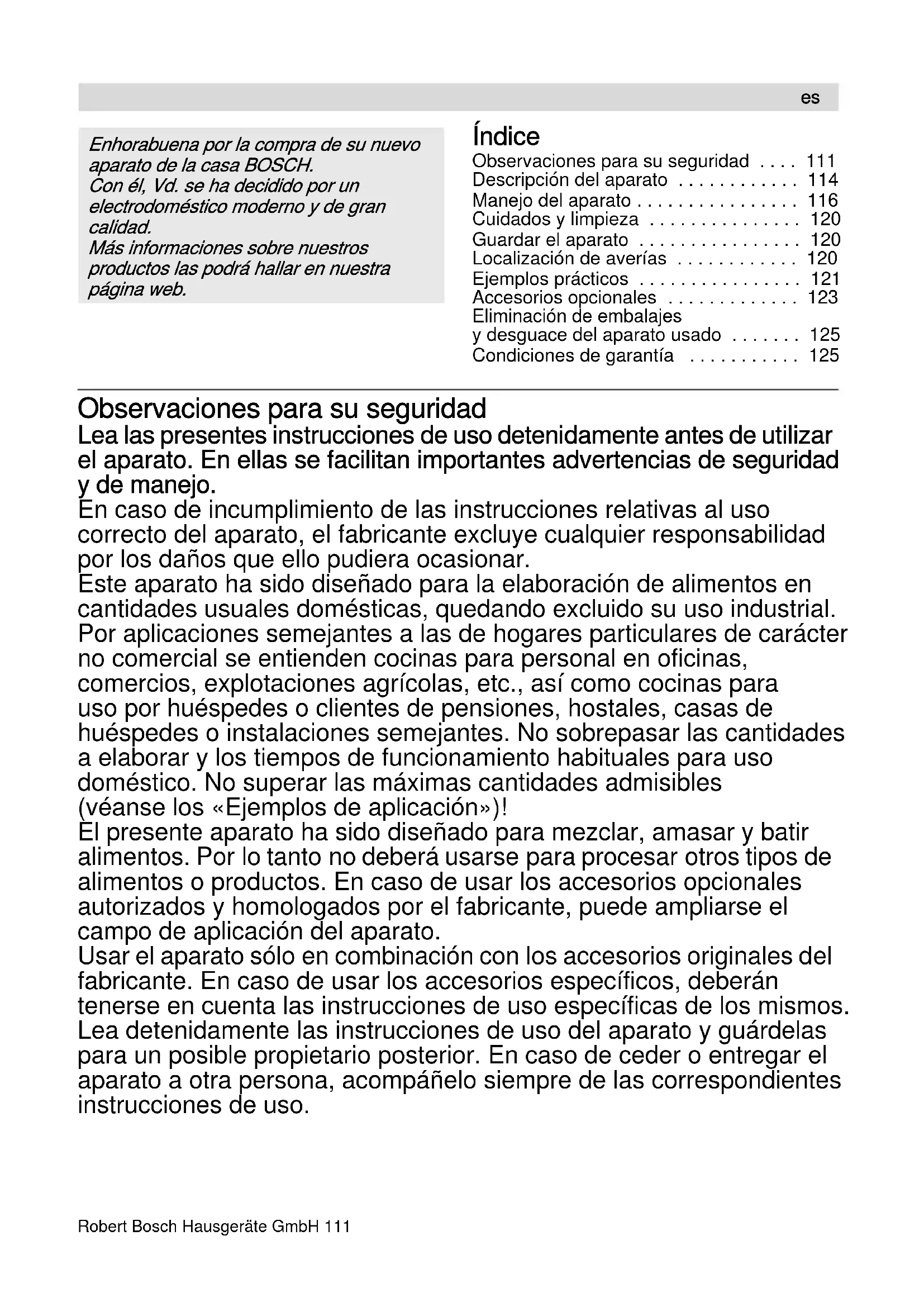 - Condiciones de garantía Observaciones para su seguridad Lea las presentes instrucciones de uso detenidamente antes de utilizar el aparato. En ellas se facilitan importantes advertencias de seguridad y de manejo. En caso de incumplimiento de las instrucciones relativas al uso correcto del aparato, el fabricante excluye cualquier responsabilidad por los daños que ello pudiera ocasionar. Este aparato ha sido diseñado para la elaboración de alimentos en cantidades usuales domésticas, quedando excluido su uso industrial. Por aplicaciones semejantes a las de hogares particulares de carácter no comercial se entienden cocinas para personal en oficinas, comercios, explotaciones agrícolas, etc., así como cocinas para uso por huéspedes o clientes de pensiones, hostales, casas de huéspedes o instalaciones semejantes. No sobrepasar las cantidades a elaborar y los tiempos de funcionamiento habituales para uso doméstico. No superar las máximas cantidades admisibles (véanse los «Ejemplos de aplicación»)! El presente aparato ha sido diseñado para mezclar, amasar y batir alimentos. Por lo tanto no deberá usarse para procesar otros tipos de alimentos o productos. En caso de usar los accesorios opcionales autorizados y homologados por el fabricante, puede ampliarse el campo de aplicación del aparato. Usar el aparato sólo en combinación con los accesorios originales del fabricante. En caso de usar los accesorios específicos, deberán tenerse en cuenta las instrucciones de uso específicas de los mismos. Lea detenidamente las instrucciones de uso del aparato y guárdelas para un posible propietario posterior. En caso de ceder o entregar el aparato a otra persona, acompáñelo siempre de las correspondientes instrucciones de uso. p. 125