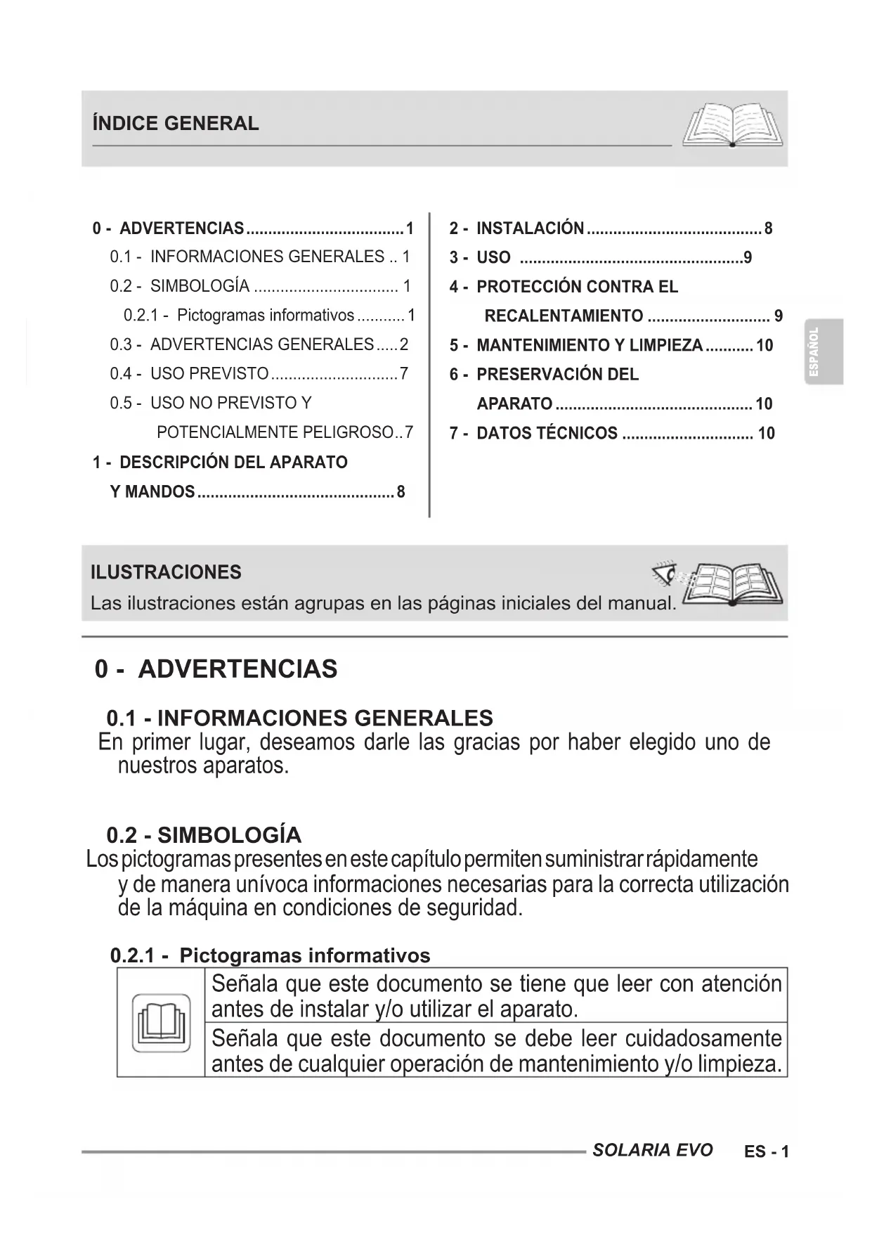 - Señala que este documento se tiene que leer con atención antes de instalar y/o utilizar el aparato. Señala que este documento se debe leer cuidadosamente antes de cualquier operación de mantenimiento y/o limpieza. ILUSTRACIONES Las ilustraciones están agrupas en las páginas iniciales del manual. 0 - ADVERTENCIAS p. 10