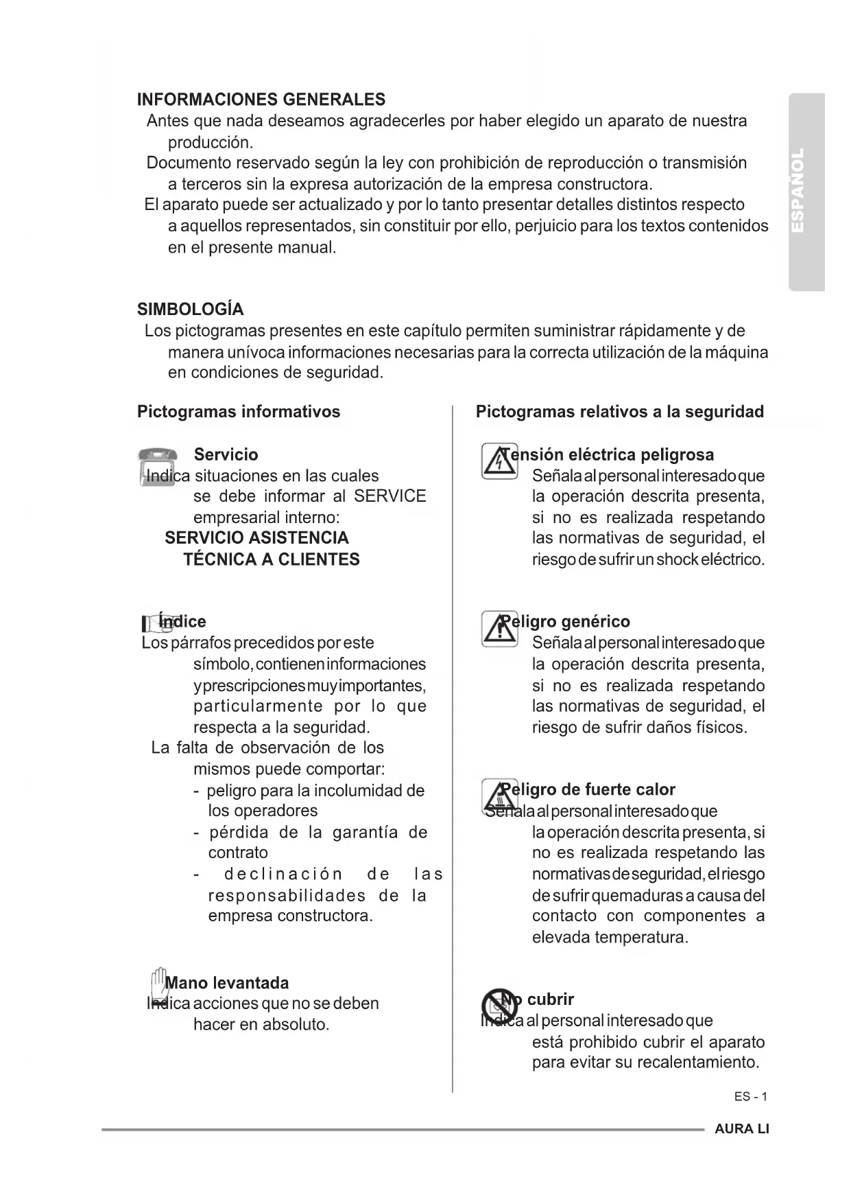 d. Auch nach einer gewissen Zeit der Benutzung des Geräts verbessert sich die Luftqualität nicht. - Die Filter sind verschmutzt. e. Anzeige-LEDs Betriebszeit blinken. - Die Frontplatte (1) ist nicht richtig am Gerätekörper (6) verankert.AURA LI ESPAÑOL ES - 1 INFORMACIONES GENERALES Antes que nada deseamos agradecerles por haber elegido un aparato de nuestra producción. Documento reservado según la ley con prohibición de reproducción o transmisión a terceros sin la expresa autorización de la empresa constructora. El aparato puede ser actualizado y por lo tanto presentar detalles distintos respecto a aquellos representados, sin constituir por ello, perjuicio para los textos contenidos en el presente manual. SIMBOLOGÍA Los pictogramas presentes en este capítulo permiten suministrar rápidamente y de manera unívoca informaciones necesarias para la correcta utilización de la máquina en condiciones de seguridad. Pictogramas informativos Servicio Indica situaciones en las cuales se debe informar al SERVICE empresarial interno: SERVICIO ASISTENCIA