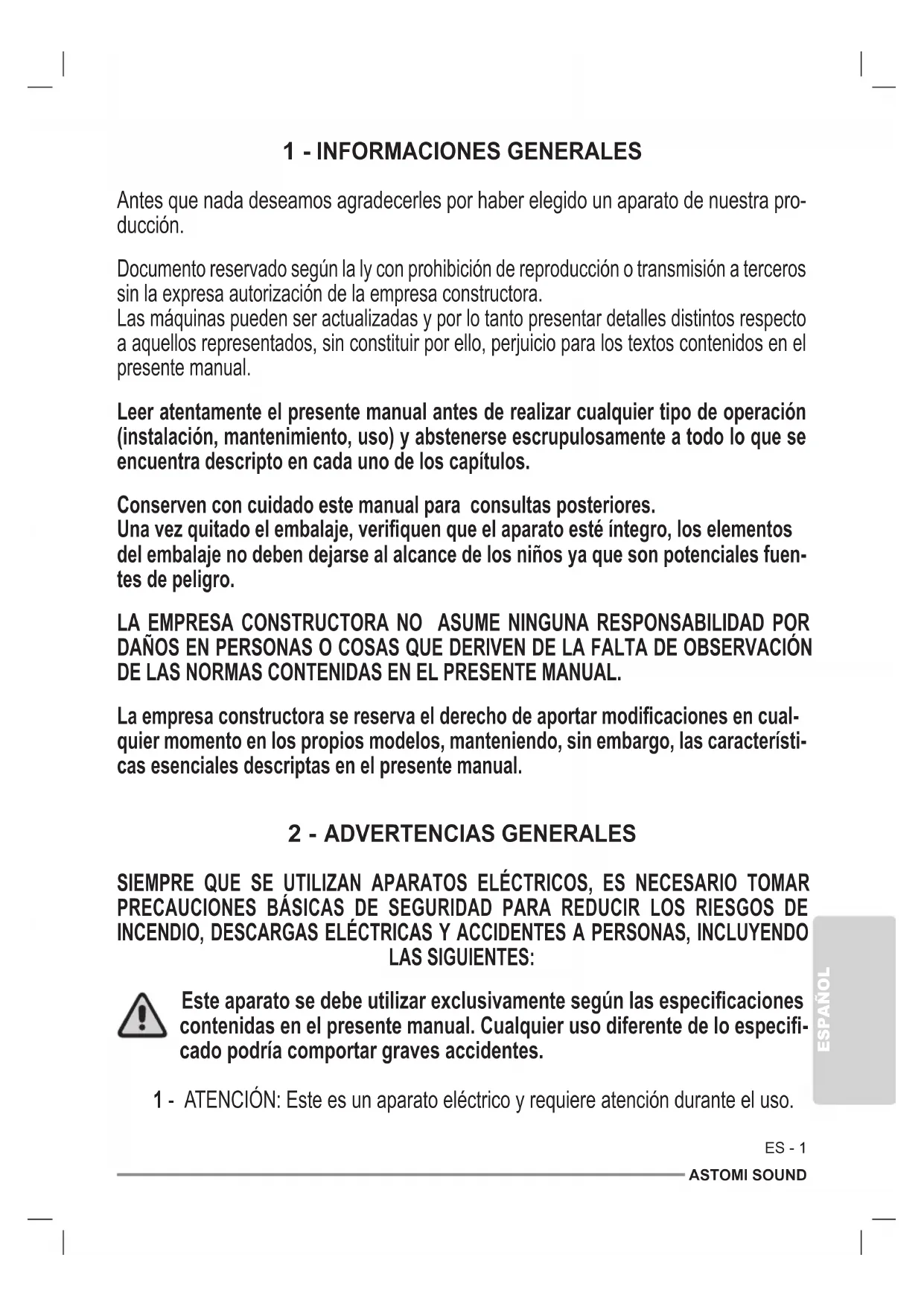 INFORMACIONES GENERALES Antes que nada deseamos agradecerles por haber elegido un aparato de nuestra pro- ducción. Documento reservado según la ly con prohibición de reproducción o transmisión a terceros sin la expresa autorización de la empresa constructora. Las máquinas pueden ser actualizadas y por lo tanto presentar detalles distintos respecto a aquellos representados, sin constituir por ello, perjuicio para los textos contenidos en el presente manual. Leer atentamente el presente manual antes de realizar cualquier tipo de operación (instalación, mantenimiento, uso) y abstenerse escrupulosamente a todo lo que se encuentra descripto en cada uno de los capítulos. Conserven con cuidado este manual para consultas posteriores. Una vez quitado el embalaje, veriquen que el aparato esté íntegro, los elementos del embalaje no deben dejarse al alcance de los niños ya que son potenciales fuen- tes de peligro. LA EMPRESA CONSTRUCTORA NO ASUME NINGUNA RESPONSABILIDAD POR DAÑOS EN PERSONAS O COSAS QUE DERIVEN DE LA FALTA DE OBSERVACIÓN DE LAS NORMAS CONTENIDAS EN EL PRESENTE MANUAL. La empresa constructora se reserva el derecho de aportar modicaciones en cual- quier momento en los propios modelos, manteniendo, sin embargo, las característi- cas esenciales descriptas en el presente manual.