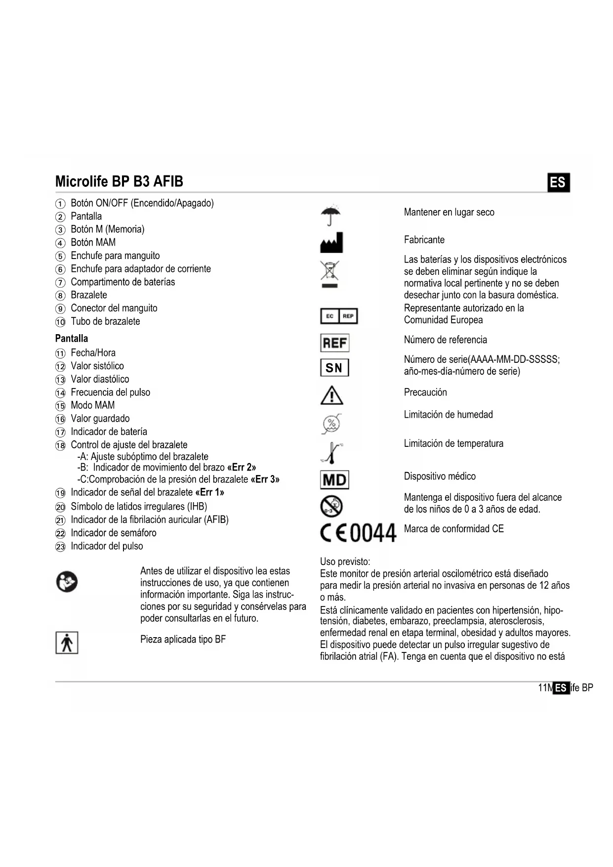 1 Botón ON/OFF (Encendido/Apagado) 2 Pantalla 3 Botón M (Memoria) 4 Botón MAM 5 Enchufe para manguito 6 Enchufe para adaptador de corriente 7 Compartimento de baterías 8 Brazalete 9 Conector del manguito AT Tubo de brazalete AK Fecha/Hora AL Valor sistólico AM Valor diastólico AN Frecuencia del pulso AO Modo MAM AP Valor guardado AQ Indicador de batería AR Control de ajuste del brazalete -A: Ajuste subóptimo del brazalete -B: Indicador de movimiento del brazo «Err 2» -C:Comprobación de la presión del brazalete «Err 3» AS Indicador de señal del brazalete «Err 1» BT Símbolo de latidos irregulares (IHB) BK Indicador de la fibrilación auricular (AFIB) BL Indicador de semáforo BM Indicador del pulso Antes de utilizar el dispositivo lea estas instrucciones de uso, ya que contienen información importante. Siga las instruc- ciones por su seguridad y consérvelas para poder consultarlas en el futuro. Pieza aplicada tipo BF Mantener en lugar seco Fabricante Las baterías y los dispositivos electrónicos se deben eliminar según indique la normativa local pertinente y no se deben desechar junto con la basura doméstica. Representante autorizado en la Comunidad Europea Número de referencia Número de serie(AAAA-MM-DD-SSSSS; año-mes-día-número de serie) Precaución Limitación de humedad Limitación de temperatura Dispositivo médico Mantenga el dispositivo fuera del alcance de los niños de 0 a 3 años de edad. Marca de conformidad CE