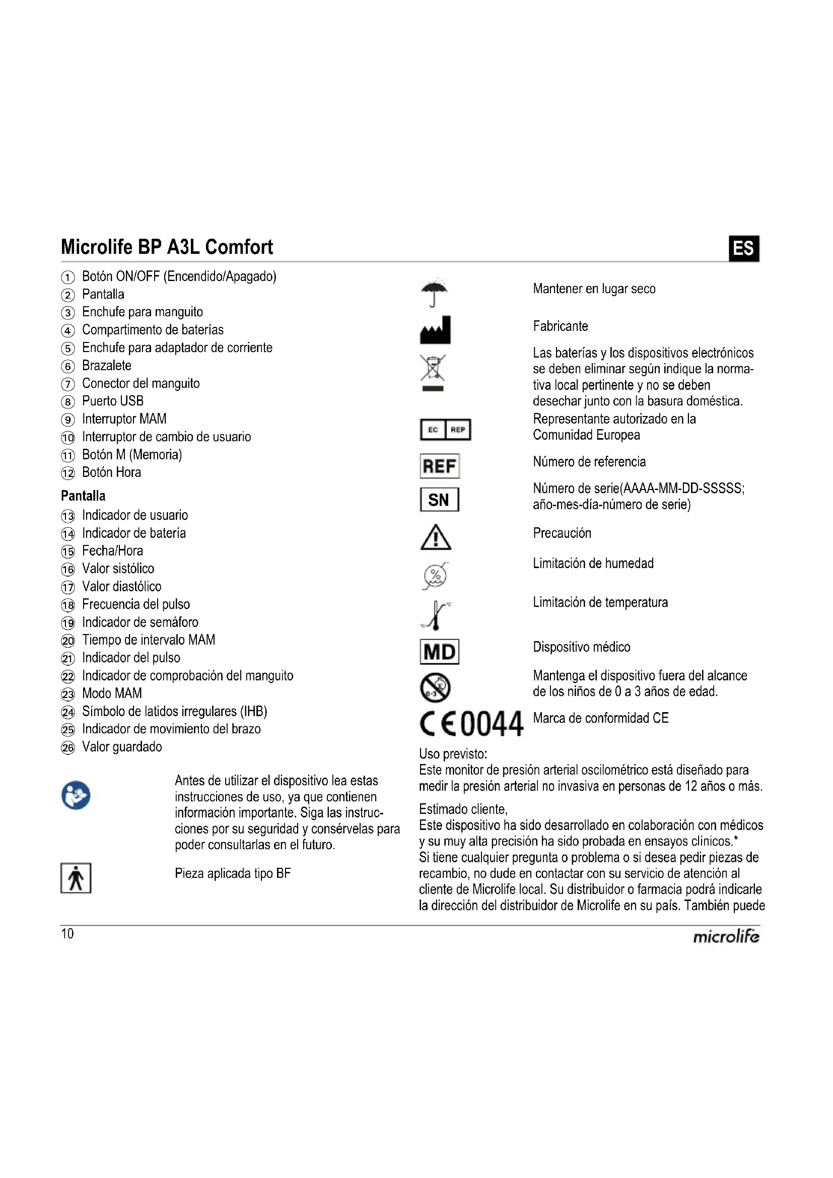 Resolution: 1 mmHg Static accuracy: within ± 3 mmHg Pulse accuracy: ± 5 % of the readout value Voltage source: 4 x 1.5 V alkaline batteries; size AA Mains adapter DC 6V, 600 mA (optional) Battery lifetime: approx. 920 measurements (using new batteries) IP Class: IP 20 Reference to standards: EN 1060-1 /-3 /-4; IEC 60601-1; IEC 60601-1-2 (EMC); IEC 60601-1-11 Expected service life: Device: 5 years or 10000 measurements, whichever comes first Accessories: 2 years or 5000 measurements, whichever comes first10 Pantalla Uso previsto: Este monitor de presión arterial oscilométrico está diseñado para medir la presión arterial no invasiva en personas de 12 años o más. Estimado cliente, Este dispositivo ha sido desarrollado en colaboración con médicos y su muy alta precisión ha sido probada en ensayos clínicos.* Si tiene cualquier pregunta o problema o si desea pedir piezas de recambio, no dude en contactar con su servicio de atención al cliente de Microlife local. Su distribuidor o farmacia podrá indicarle la dirección del distribuidor de Microlife en su país. También puede Microlife BP A3L Comfort