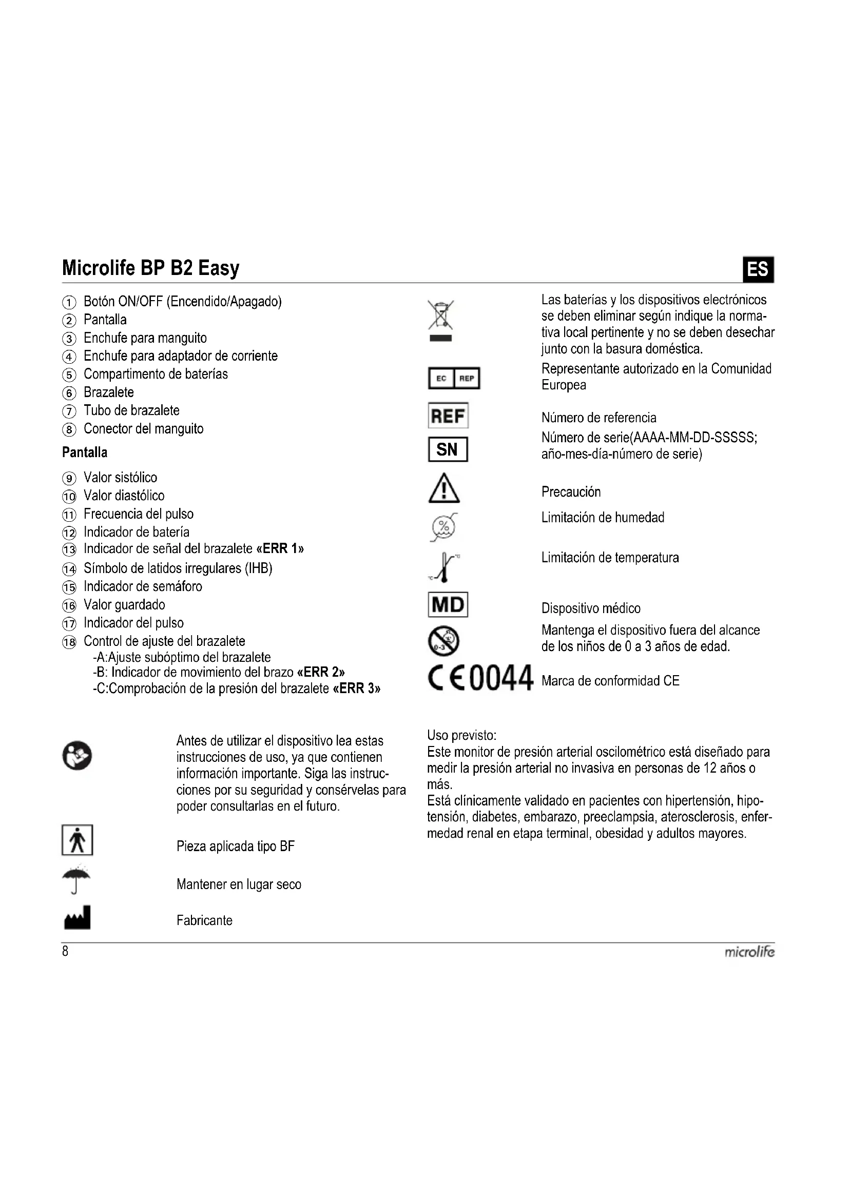 1 Botón ON/OFF (Encendido/Apagado) 2 Pantalla 3 Enchufe para manguito 4 Enchufe para adaptador de corriente 5 Compartimento de baterías 6 Brazalete 7 Tubo de brazalete 8 Conector del manguito 9 Valor sistólico AT Valor diastólico AK Frecuencia del pulso AL Indicador de batería AM Indicador de señal del brazalete «ERR 1» AN Símbolo de latidos irregulares (IHB) AO Indicador de semáforo AP Valor guardado AQ Indicador del pulso AR Control de ajuste del brazalete -A:Ajuste subóptimo del brazalete -B: Indicador de movimiento del brazo «ERR 2» -C:Comprobación de la presión del brazalete «ERR 3» Antes de utilizar el dispositivo lea estas instrucciones de uso, ya que contienen información importante. Siga las instruc- ciones por su seguridad y consérvelas para poder consultarlas en el futuro. Pieza aplicada tipo BF Mantener en lugar seco Fabricante Las baterías y los dispositivos electrónicos se deben eliminar según indique la norma- tiva local pertinente y no se deben desechar junto con la basura doméstica. Representante autorizado en la Comunidad Europea Número de referencia Número de serie(AAAA-MM-DD-SSSSS; año-mes-día-número de serie) Precaución Limitación de humedad Limitación de temperatura Dispositivo médico Mantenga el dispositivo fuera del alcance de los niños de 0 a 3 años de edad. Marca de conformidad CE
