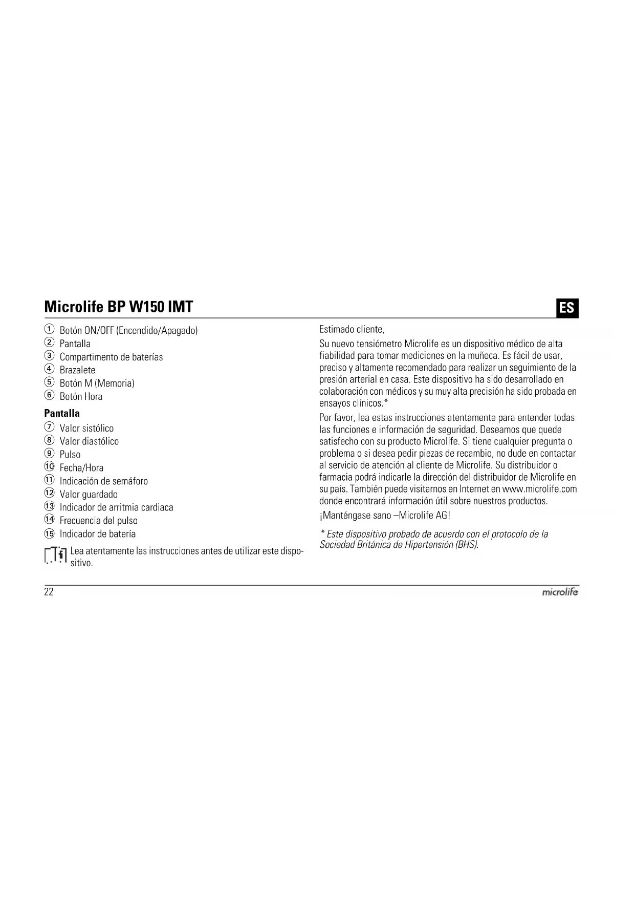 - Este dispositivo probado de acuerdo con el protocolo de la Sociedad Británica de Hipertensión (BHS). Microlife BP W150 IMT