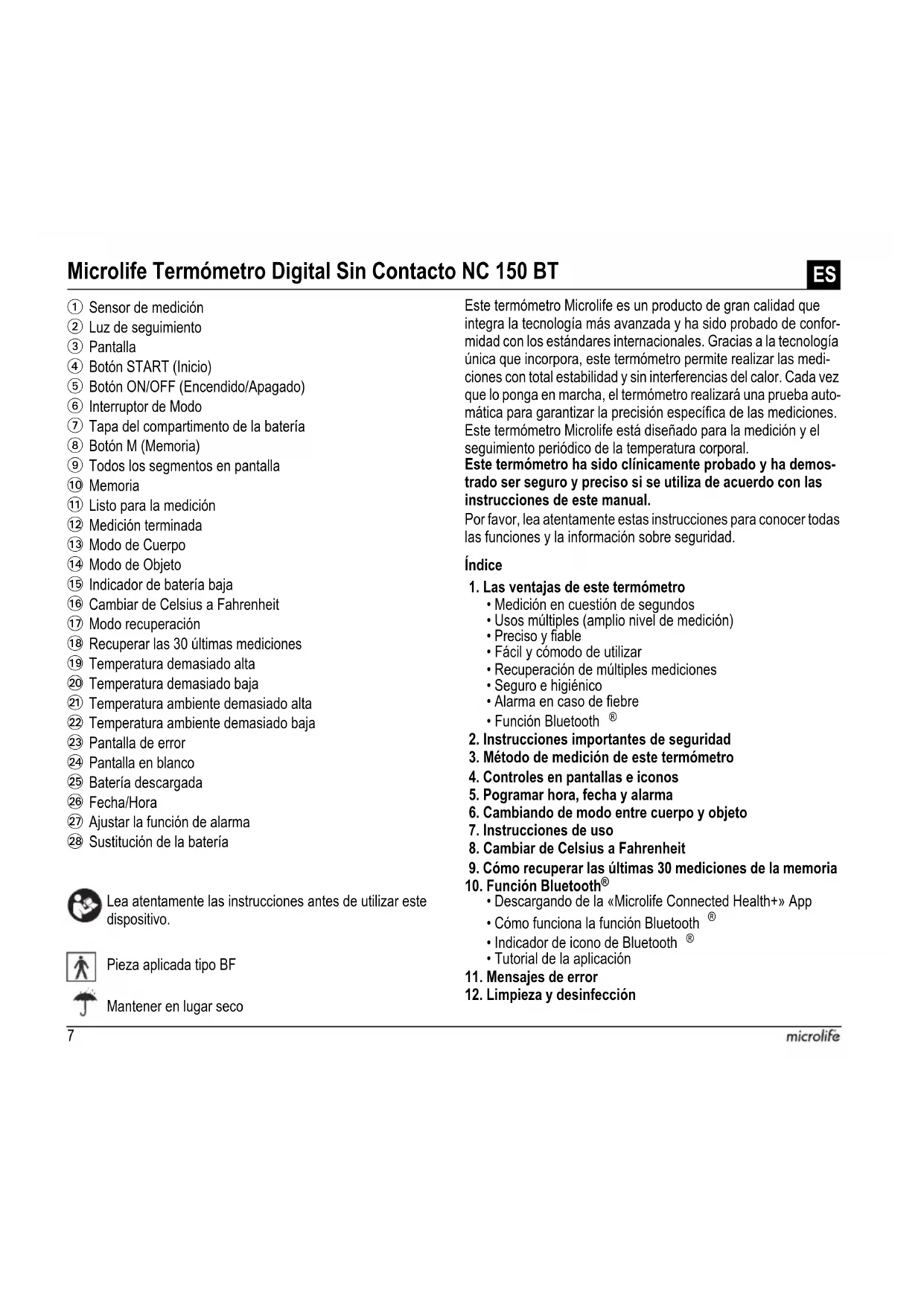 Expected service life: 5 years or 12000 measurements7 Lea atentamente las instrucciones antes de utilizar este dispositivo. Pieza aplicada tipo BF Este termómetro Microlife es un producto de gran calidad que integra la tecnología más avanzada y ha sido probado de confor- midad con los estándares internacionales. Gracias a la tecnología única que incorpora, este termómetro permite realizar las medi- ciones con total estabilidad y sin interferencias del calor. Cada vez que lo ponga en marcha, el termómetro realizará una prueba auto- mática para garantizar la precisión específica de las mediciones. Este termómetro Microlife está diseñado para la medición y el seguimiento periódico de la temperatura corporal. Este termómetro ha sido clínicamente probado y ha demos- trado ser seguro y preciso si se utiliza de acuerdo con las instrucciones de este manual. Por favor, lea atentamente estas instrucciones para conocer todas las funciones y la información sobre seguridad. Índice
