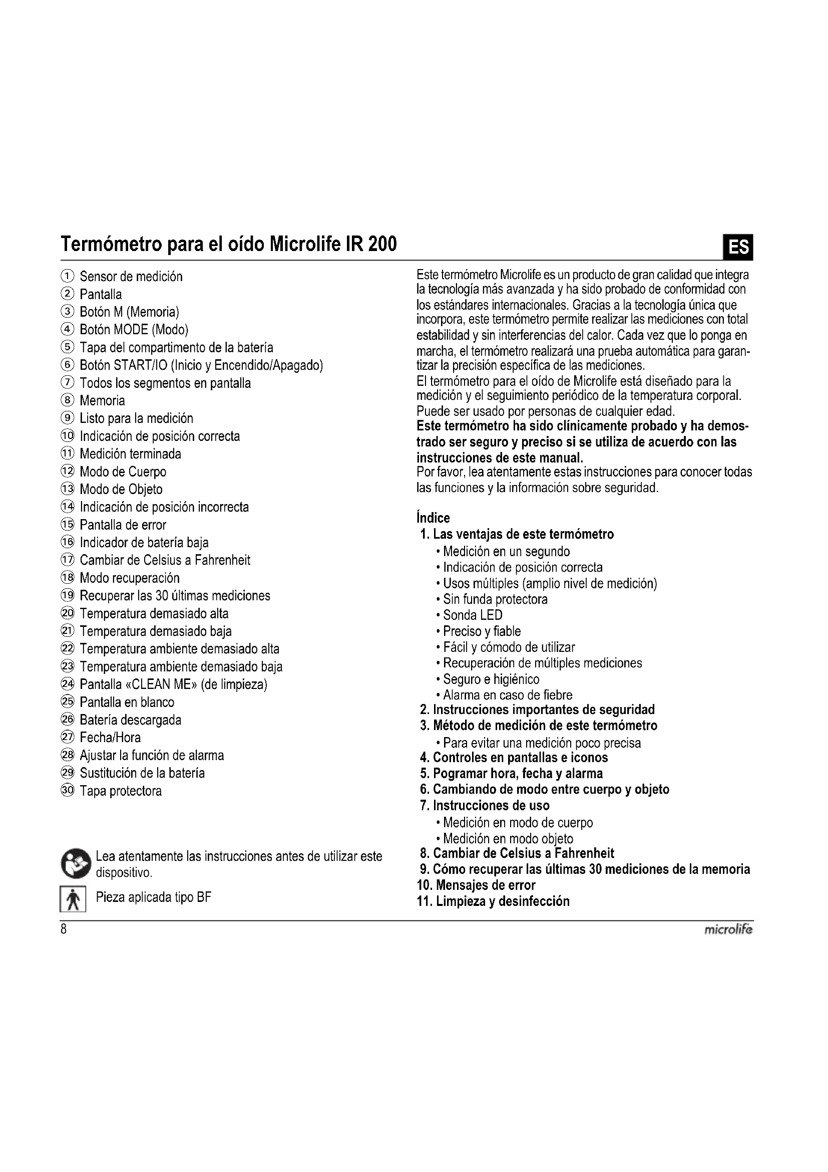Expected service life: 5 years or 12000 measurements8 Lea atentamente las instrucciones antes de utilizar este dispositivo. Pieza aplicada tipo BF Este termómetro Microlife es un producto de gran calidad que integra la tecnología más avanzada y ha sido probado de conformidad con los estándares internacionales. Gracias a la tecnología única que incorpora, este termómetro permite realizar las mediciones con total estabilidad y sin interferencias del calor. Cada vez que lo ponga en marcha, el termómetro realizará una prueba automática para garan- tizar la precisión específica de las mediciones. El termómetro para el oído de Microlife está diseñado para la medición y el seguimiento periódico de la temperatura corporal. Puede ser usado por personas de cualquier edad. Este termómetro ha sido clínicamente probado y ha demos- trado ser seguro y preciso si se utiliza de acuerdo con las instrucciones de este manual. Por favor, lea atentamente estas instrucciones para conocer todas las funciones y la información sobre seguridad. Índice