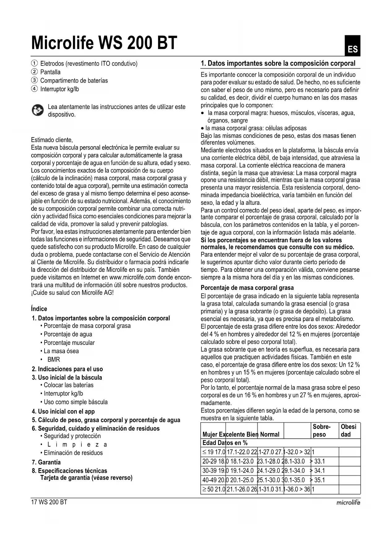 Wortmarke und Logos sind registrierte Handels- marken im Besitz der Bluetooth SIG, Inc. und jedweder Verwen- dung dieser Marken von Microlife Corp. erfolgt unter Lizenz. Weitere Handelsmarken und Handelsnamen sind Eigentum der jeweiligen Inhaber.17 WS 200 BT Lea atentamente las instrucciones antes de utilizar este dispositivo. Estimado cliente, Esta nueva báscula personal electrónica le permite evaluar su composición corporal y para calcular automáticamente la grasa corporal y porcentaje de agua en función de su altura, edad y sexo. Los conocimientos exactos de la composición de su cuerpo (cálculo de la inclinación) masa corporal, masa corporal grasa y contenido total de agua corporal), permite una estimación correcta del exceso de grasa y al mismo tiempo determina el peso aconse- jable en función de su estado nutricional. Además, el conocimiento de su composición corporal permite combinar una correcta nutri- ción y actividad física como esenciales condiciones para mejorar la calidad de vida, promover la salud y prevenir patologías. Por favor, lea estas instrucciones atentamente para entender bien todas las funciones e informaciones de seguridad. Deseamos que quede satisfecho con su producto Microlife. En caso de cualquier duda o problema, puede contactarse con el Servicio de Atención al Cliente de Microlife. Su distribuidor o farmacia podrá indicarle la dirección del distribuidor de Microlife en su país. También puede visitarnos en Internet en www.microlife.com donde encon- trará una multitud de información útil sobre nuestros productos. ¡Cuide su salud con Microlife AG! Índice