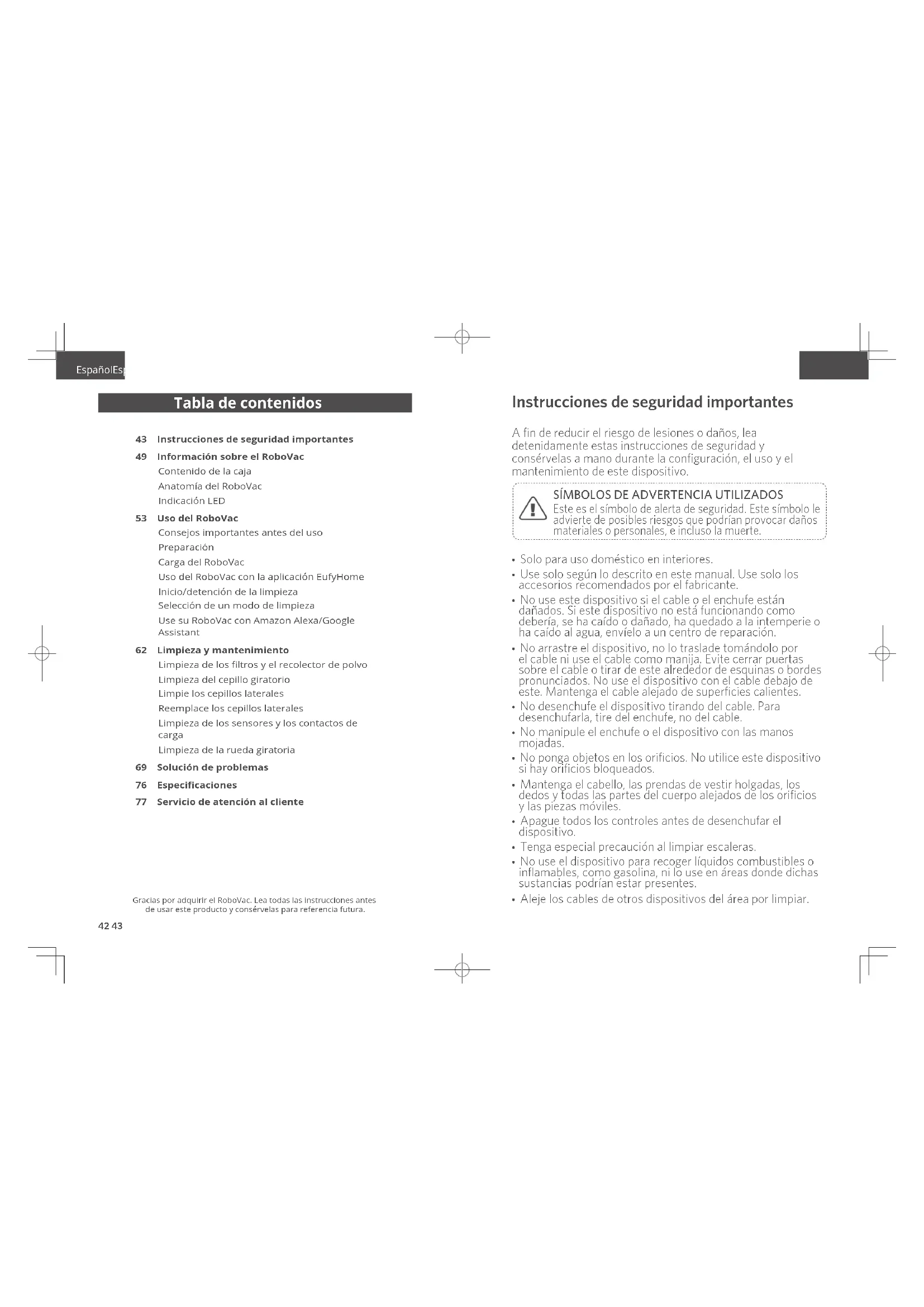 Cleaning Time Max. 100 mins Charging Time 300 - 360 mins Charging Temperature 5°C - 40°C Storage Temperature -20°C - 60°C Input 19 V 0.6 A Output 19 V 0.6 A Customer Service For FAQs and more information, please visit www.eufylife.com. support@eufylife.com support.mea@anker.com (For Middle East and Africa Only) service@myeufy.com.au www.eufylife.com (US) +1 (800) 988 7973 Mon-Fri 9:00am - 5:00pm (PT) (UK) +44 (0) 1604 936200 Mon-Fri 6:00 - 11:00 (GMT) (DE) +49 (0) 69 9579 7960 Mo-Fr 6:00 - 11:00 (中国) +86 400 0550 036 周一至周五 9:00 - 17:30 (日本) 03 4455 7823 月-金 9:00 - 17:00 (Middle East & Africa) +971 42463266 Sun-Thu 9:00 - 17:30 (GMT+4) (UAE) +971 8000320817 Sun-Thu 9:00 - 17:30 (GMT+4) (KSA) +966 8008500030 Sun-Thu 8:00 - 16:30 (GMT+3) (Kuwait) +965 22069086 Sun-Thu 8:00 - 16:30 (GMT+3) (Egypt) +20 8000000826 Sun-Thu 7:00 - 15:30 (GMT+2) (KR) +82 02-1670-7098 Mon-Fri 10:00 - 17: 00 (GMT+1) (AU) +61 3 8331 4800 Mon-Fri 8:30 - 17:00 (AEST) @EufyOcial @EufyOcial@EufyOcial @EufyOcial Anker Innovations Limited Room 1318-19, Hollywood Plaza, 610 Nathan Road, Mongkok, Kowloon, Hong Kong42 43 Español Español Gracias por adquirir el RoboVac. Lea todas las instrucciones antes de usar este producto y consérvelas para referencia futura. 43 Instruccionesdeseguridadimportantes 49 Información sobre el RoboVac Contenido de la caja Anatomía del RoboVac Indicación LED 53UsodelRoboVac Consejos importantes antes del uso Preparación Carga del RoboVac Uso del RoboVac con la aplicación EufyHome Inicio/detención de la limpieza Selección de un modo de limpieza Use su RoboVac con Amazon Alexa/Google Assistant 62 Limpieza y mantenimiento Limpieza de los ltros y el recolector de polvo Limpieza del cepillo giratorio Limpie los cepillos laterales Reemplace los cepillos laterales Limpieza de los sensores y los contactos de carga Limpieza de la rueda giratoria 69Solucióndeproblemas 76Especicaciones 77Serviciodeatenciónalcliente Tabladecontenidos Instrucciones de seguridad importantes A fin de reducir el riesgo de lesiones o daños, lea detenidamente estas instrucciones de seguridad y consérvelas a mano durante la configuración, el uso y el mantenimiento de este dispositivo.