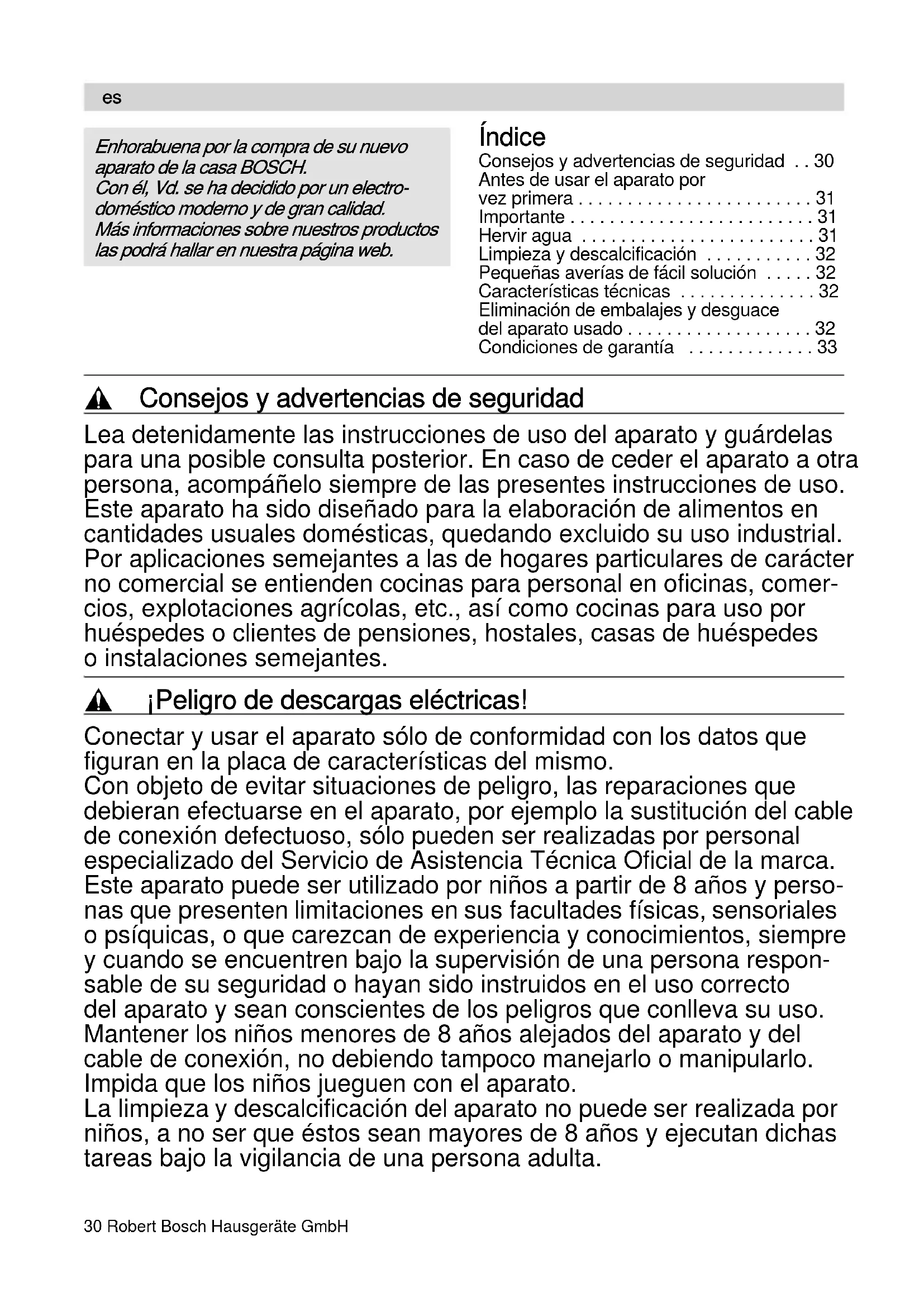 Enhorabuena por la compra de su nuevo aparato de la casa BOSCH. Con él, Vd. se ha decidido por un electro- doméstico moderno y de gran calidad. Más informaciones sobre nuestros productos las podrá hallar en nuestra página web.Robert Bosch Hausgeräte GmbH 31 No sumergir nunca el aparato, la base y el cable de conexión en el agua. Usar la jarra solo en combinación con la base adjunta. No conectar el aparato a la red eléctrica en caso de presentar el cable de conexión o el aparato mismo huellas visibles de desperfectos. En caso de avería deberá extraerse inmediatamente el cable de conexión de la toma de corriente o desconectar la tensión de red. , ¡Peligro de incendio! No colocar la base o la jarra sobre o en las proximidades de una fuente de fuego caliente, por ejemplo las zonas de cocción de una cocina o placa encimera. , ¡Peligro de quemadura! El aparato se calienta fuertemente durante su funcionamiento. Sujetarlo por lo tanto solo por las asas. Abrir la tapa solo una vez que el aparato se haya enfriado. Usar el aparato solo con la tapa cerrada. ¡Peligro de quemadura por salpicaduras en caso de llenar una excesiva cantidad de agua en el aparato, superando la marca de máximo nivel «MAX!»! No usar el aparato en las proximidades de bañeras, lavabos o cualquier otro recipiente lleno de agua! , ¡Peligro de asfixia! No permita que los niños jueguen con el embalaje. Las presentes instrucciones de uso se refieren a los modelos de 2400 W/240V y 3100 W/240 V. Antes de usar el aparato por vez primera